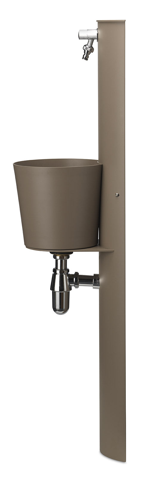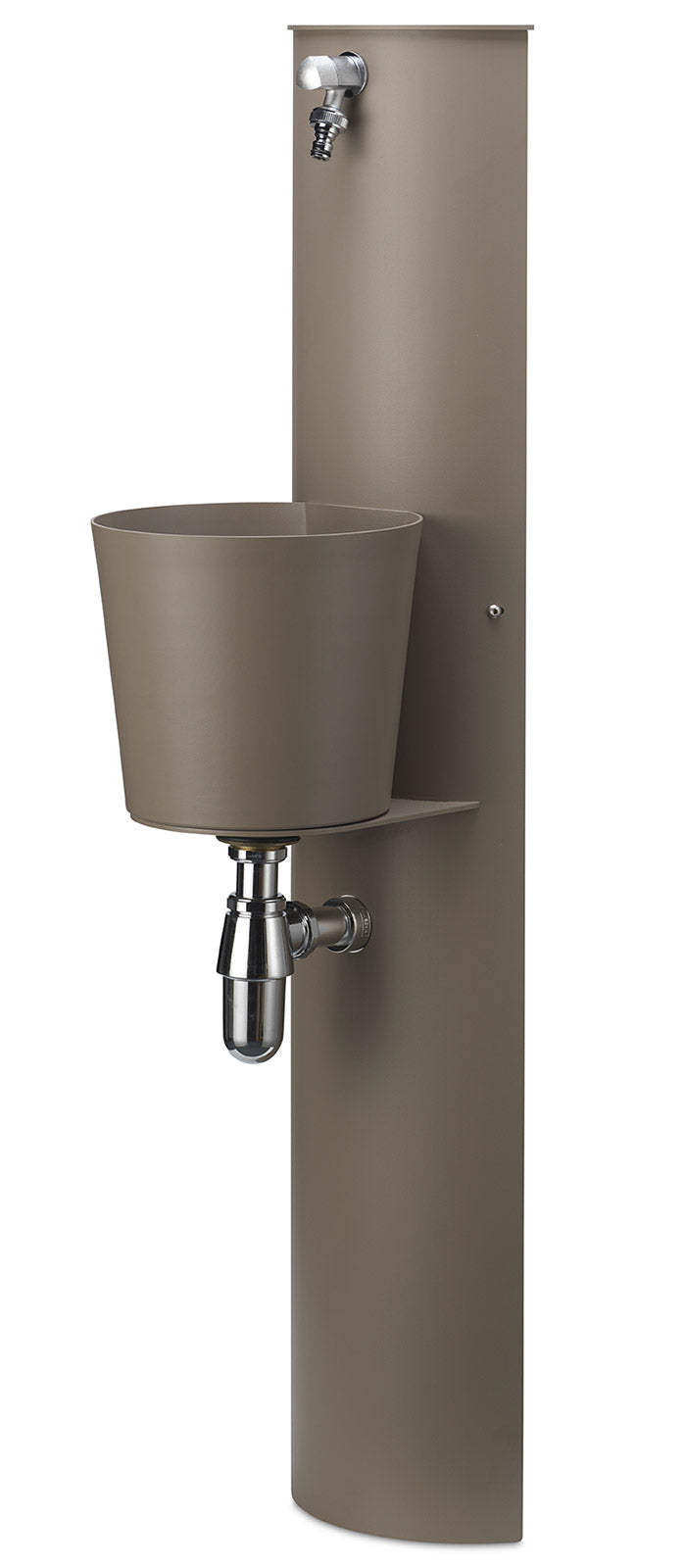 Gartenwandbrunnen mit innovativem und originellem Design , 42/PRT mit Wasserhahn und Eimer von Belfer , der die Installation mit Wasser-/Abflussanschlüssen in variablen Höhen ermöglicht: Wasseranschlusshöhe von 0 bis 116 cm, Ablaufanschlusshöhe von 0 bis 55 cm.