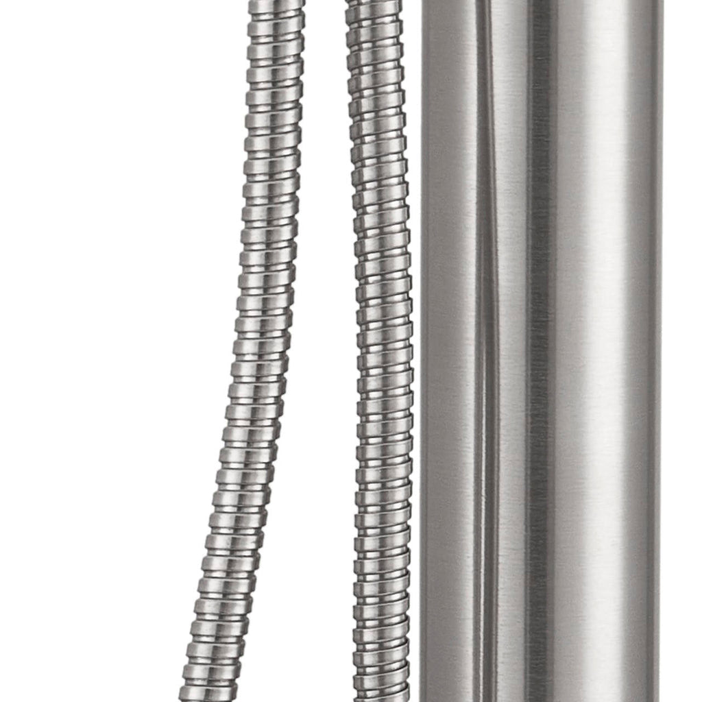 Außenbrunnen aus Edelstahl mit Handbrause. Ausgestattet mit einem Dreiwegeventil, das das Mischen von Brausekopf und mobiler Handbrause ermöglicht. Mit Warm- und Kaltwasserzulauf, aus hochwertigem Edelstahl 316L. Innen- und Außeneinsatz.