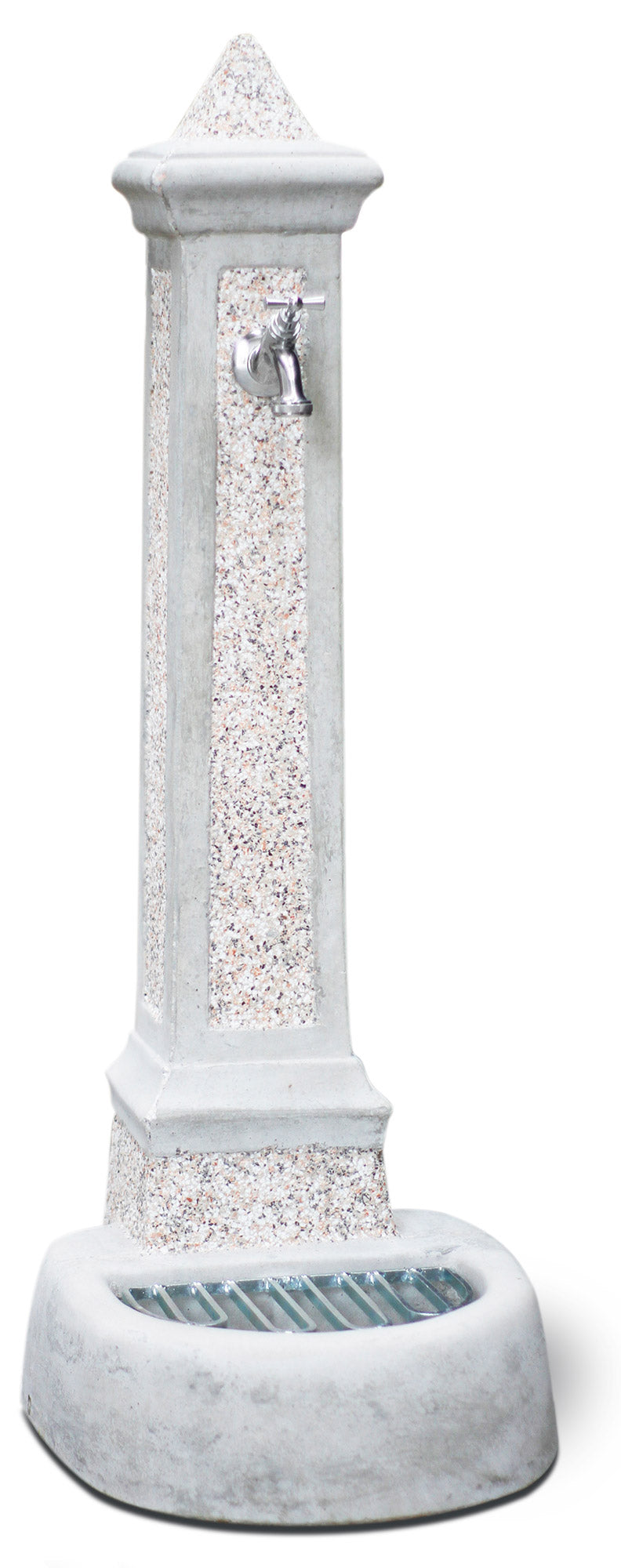Fontana da giardino in cemento e granulato di marmo La fontana da giardino Modello Pisa è un modello tradizionale e senza tempo. Realizzata in cemento grigio e granuto di marmo bianco, finitura bocciardata. All'interno della colonna è predisposta la tubazione da 1/2" che porta l'acqua al rubinetto. Alla fontana può essere abbinato qualunque rubinetto con attacco M 1/2". Prodotto 100% Made in Italy