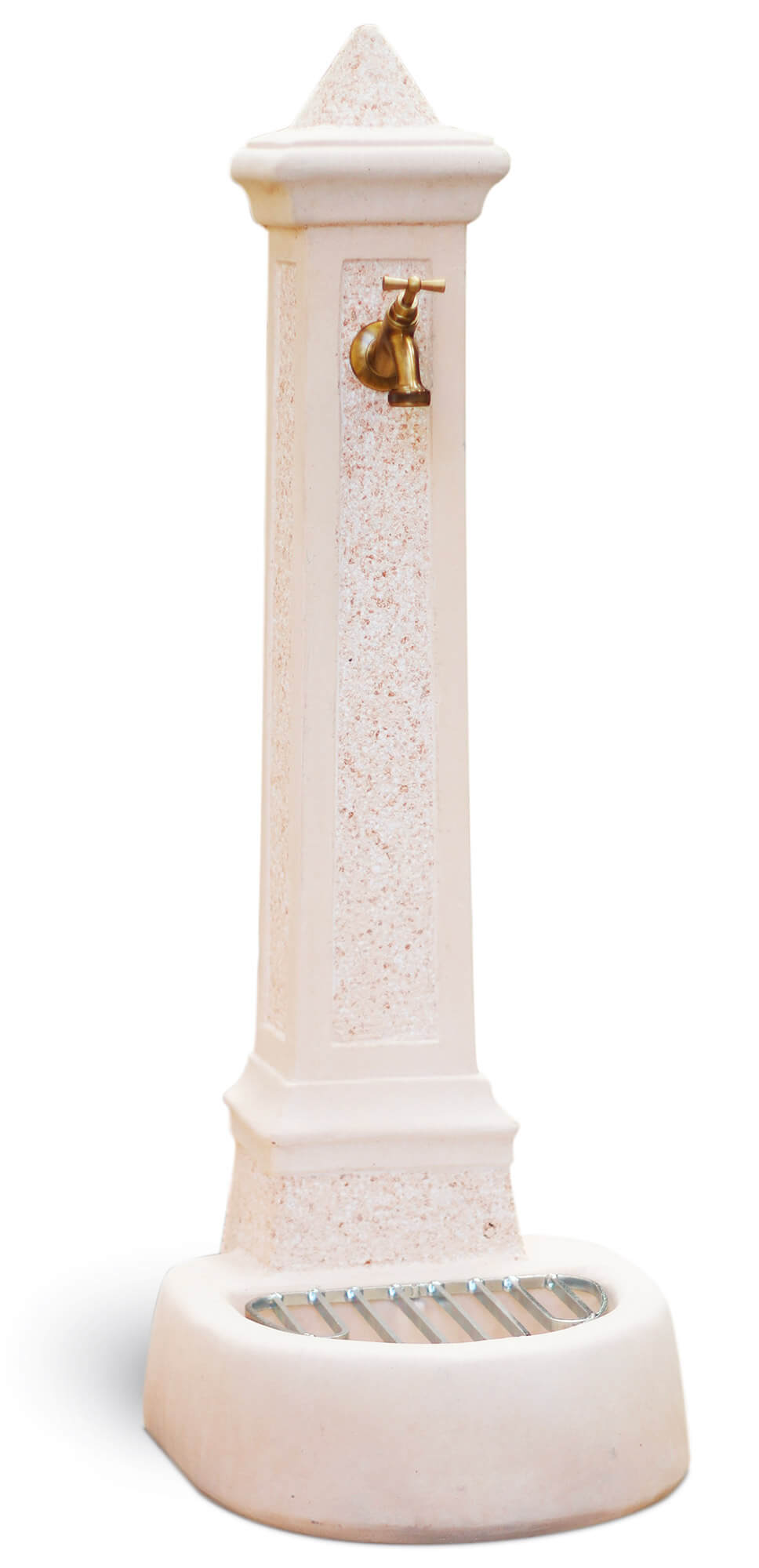 Fontana da giardino in cemento e granulato di marmo La fontana da giardino Modello Pisa è un modello tradizionale e senza tempo. Realizzata in cemento grigio e granuto di marmo bianco, finitura bocciardata. All'interno della colonna è predisposta la tubazione da 1/2" che porta l'acqua al rubinetto. Alla fontana può essere abbinato qualunque rubinetto con attacco M 1/2". Prodotto 100% Made in Italy