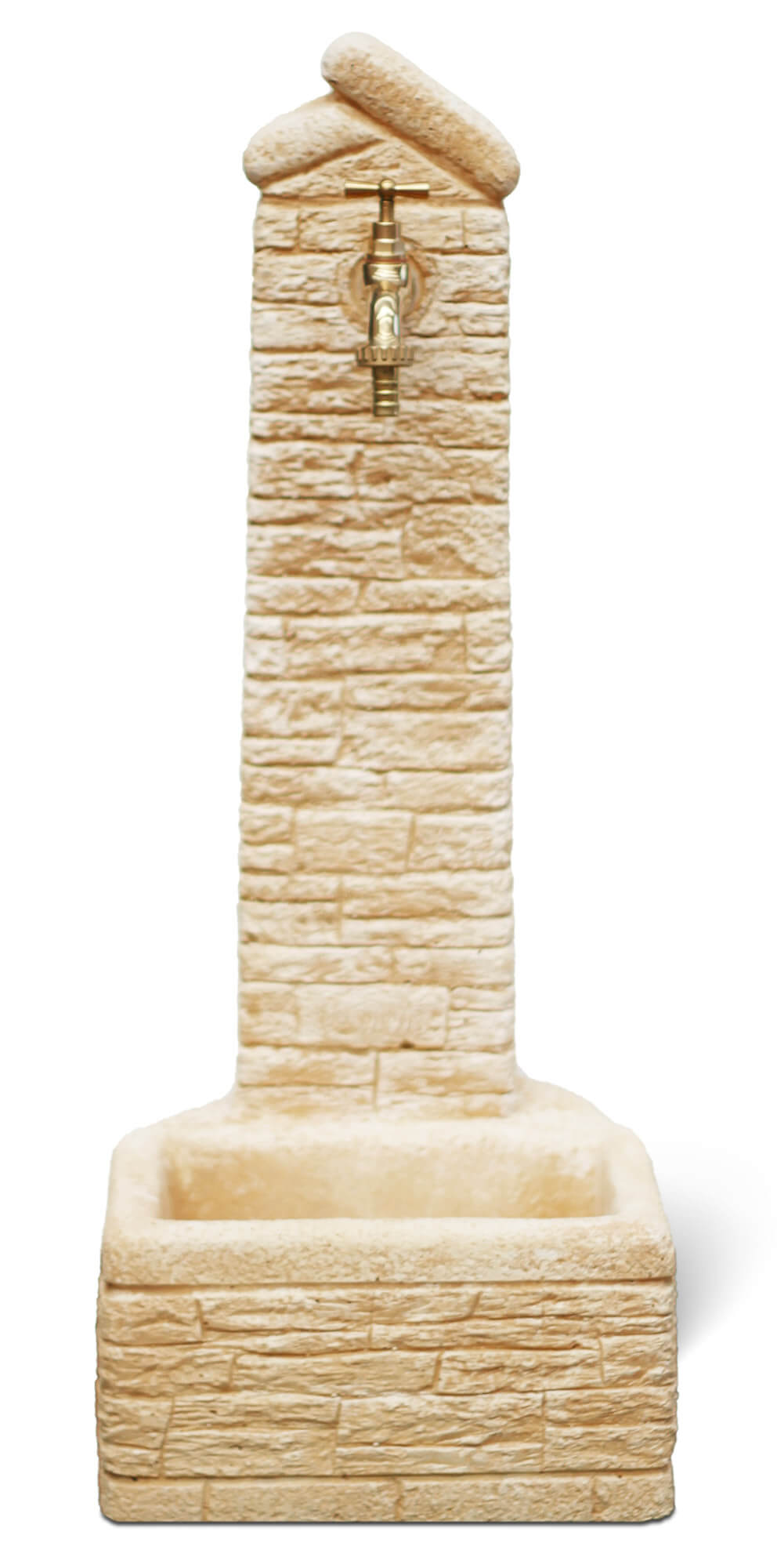 Fontana da giardino in cemento e granulato di marmo La fontana da giardino Modello Zambla dona un tocco rustico ad ogni giardino. La trama effetto pietra ricostruita ricorda un muro in mattoncino toccato dal tempo. Realizzata in cemento e granuto di marmo bianco. All'interno della colonna è predisposta la tubazione da 1/2" che porta l'acqua al rubinetto. Alla fontana può essere abbinato qualunque rubinetto con attacco M 1/2". Prodotto 100% Made in Italy