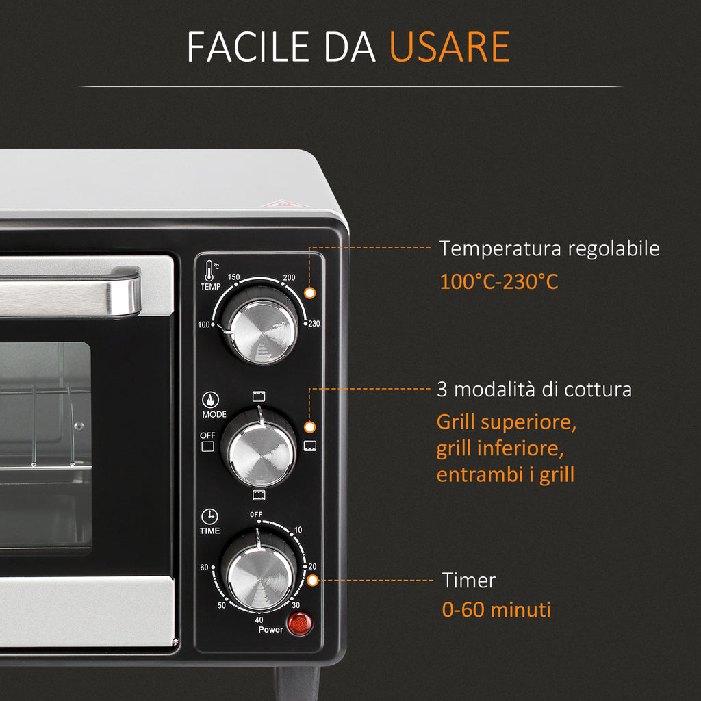 - 16L FASSUNGSVERMÖGEN und KOMPAKTES DESIGN: Dieser kleine und kompakte Elektroofen ermöglicht es Ihnen, Brotscheiben oder Pizzas und Kuchen mit einem Durchmesser von 25 cm zu erhitzen. Dank seiner geringen Größe nimmt es nicht zu viel Platz in Ihrer Küche ein.
