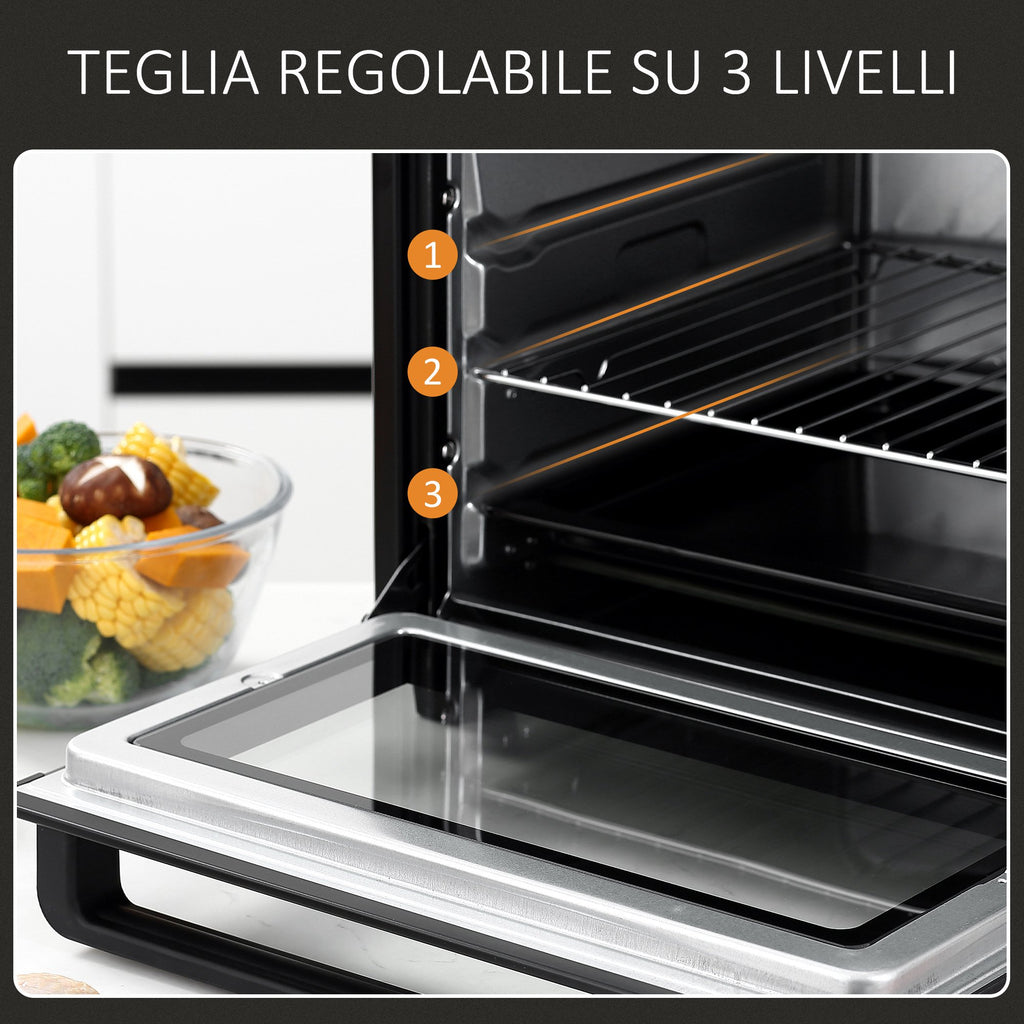 Möchten Sie leckeres Essen für jeden Moment in Gesellschaft zubereiten? Probieren Sie unseren Elektroofen aus. Die einstellbare Temperatur und der Timer ermöglichen es Ihnen, jedes Gericht nach Ihren Wünschen zuzubereiten, und Sie können zwischen 3 verschiedenen Garmodi wählen: nur oberer Grill, nur unterer Grill oder beides. Es enthält einen Grill und ein Backblech, das auf 3 Ebenen positioniert werden kann, perfekt zum Aufwärmen von Pizzen, Brotscheiben und vielem mehr. Das unverzichtbare Küchengerät!