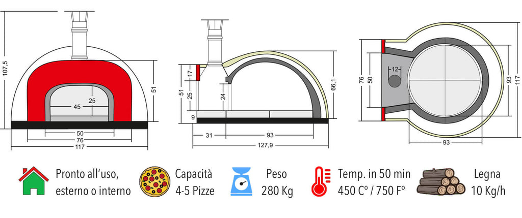 Subito Cotto 95 ist ein echter Holzofen mit reduzierter Größe und Gewicht, dessen Deckel und Kuppel vollständig aus hochwertigem feuerfestem Beton bestehen und sich ideal für den privaten Gebrauch eignen. Wie bei einem traditionellen Holzofen wird die Gartemperatur im Inneren lange gehalten, auch wenn das Feuer oder die Flamme aus sind. Der Ofen ist ideal zum Backen von Pizza nach italienischer Art, aber es können auch viele andere Gerichte zubereitet werden, wie: Brot, Fleisch, Fisch, Gemüse und Süßigkeiten Alle Subito Cotto- Modelle sind gebrauchsfertig, sie müssen nicht zusammengebaut, isoliert oder fertig gestellt werden . Sie sind leicht und können auch auf kleinem Raum transportiert und verwendet werden: Terrassen, Küchen, Gärten.Der Holzverbrauch ist gering, die Kochtemperatur kann in nur 50 Minuten schnell auf 450 °C (750 °F) erreicht werden. Subito Cotto ist ein 100 % Made in Italy- zertifiziertes Produkt, alle Komponenten von Subito Cotto werden in Italien in einer einzigen, vollständig handwerklichen Fabrik hergestellt.