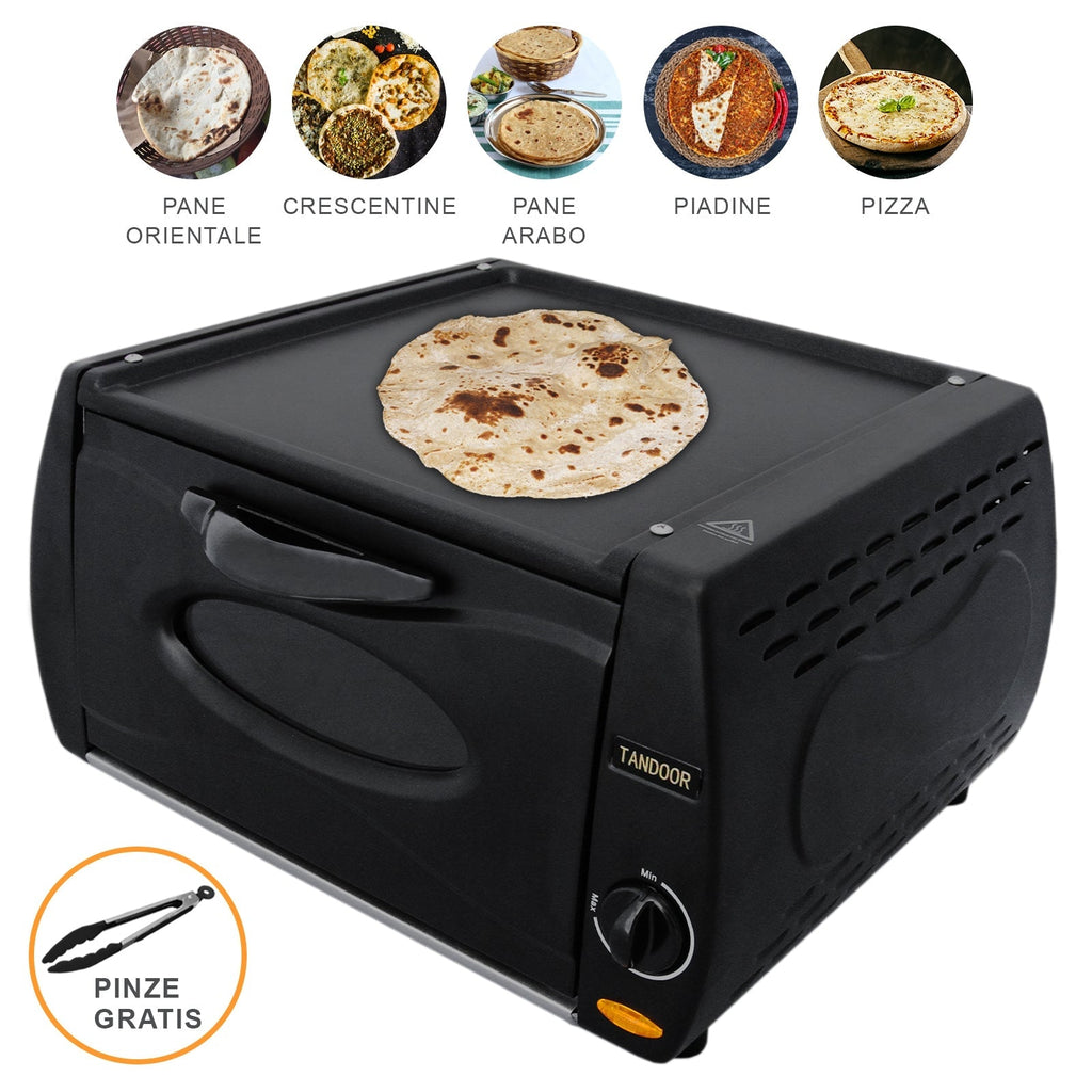 Forno Tandoor elettrico per pizze, piadine e pane perfetto per uso domestico o attività commerciali. Piastra superiore con copertura anti aderente e vetro di sicurezza resistente al calore.
