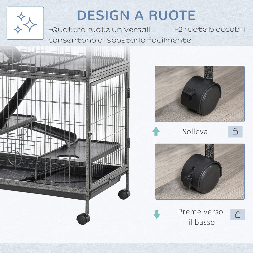 - 4 ruote per facilitare gli spostamenti di cui 2 bloccabili per mantenere la gabbia per animali in posizione