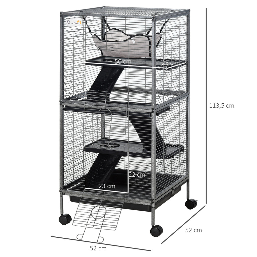 Dieser Käfig ist das perfekte Zuhause für Nager und Kleintiere. Die Struktur besteht aus Metall und erstreckt sich über 3 Etagen, die jeweils durch eine Kunststofframpe miteinander verbunden sind. Es enthält eine Hängematte, in der Ihr kleiner Freund ein Nickerchen machen kann, und ein abnehmbares Tablett an der Basis. Dank der 4 Rollen können Sie es bequem von einem Raum zum anderen bewegen, ohne seinen Mieter zu stören.