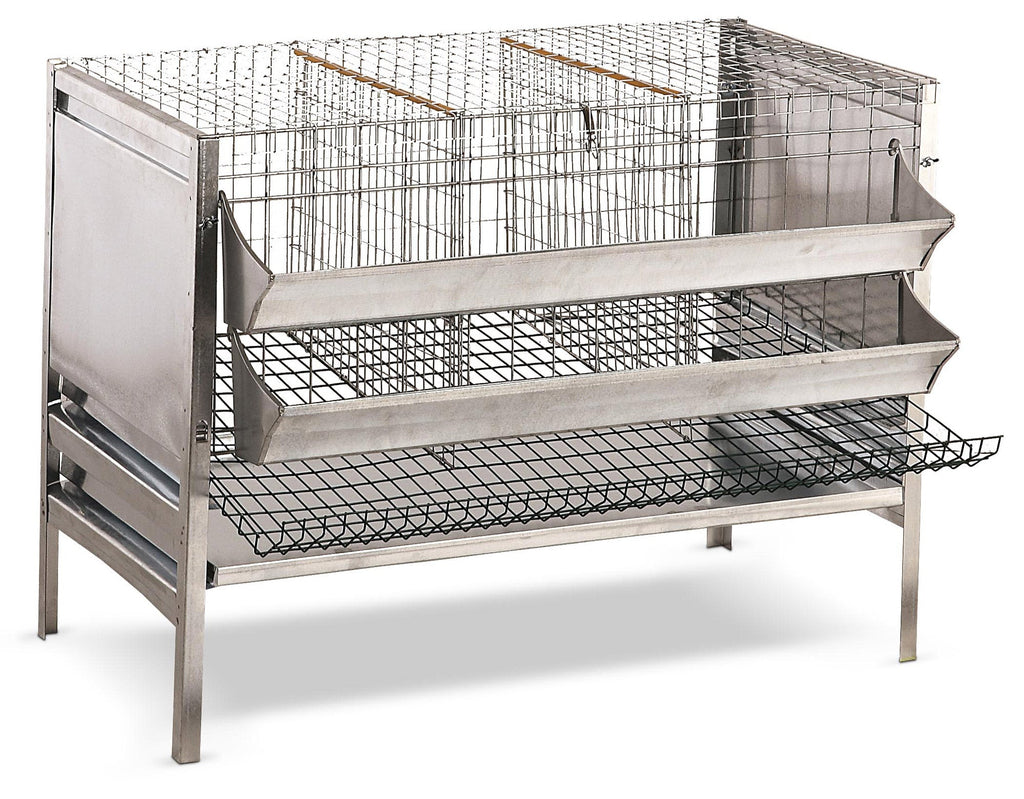 Abnehmbarer Landkäfig für Legehennen aus verzinktem Blech, komplett mit Tränke und Futtertrog.