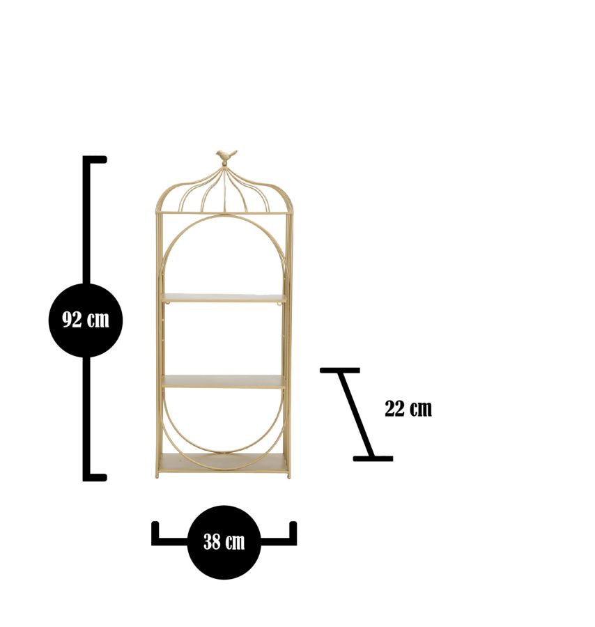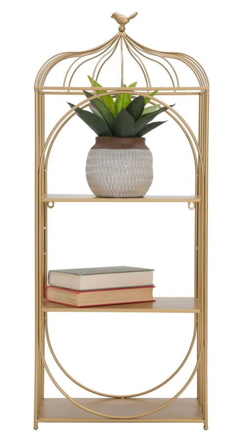 Besonderes Wandregal aus goldenem Metall mit 3 Regalen, deren Design an einen kleinen Käfig erinnert. Eine besondere Note zum Aufbewahren von Gegenständen.
