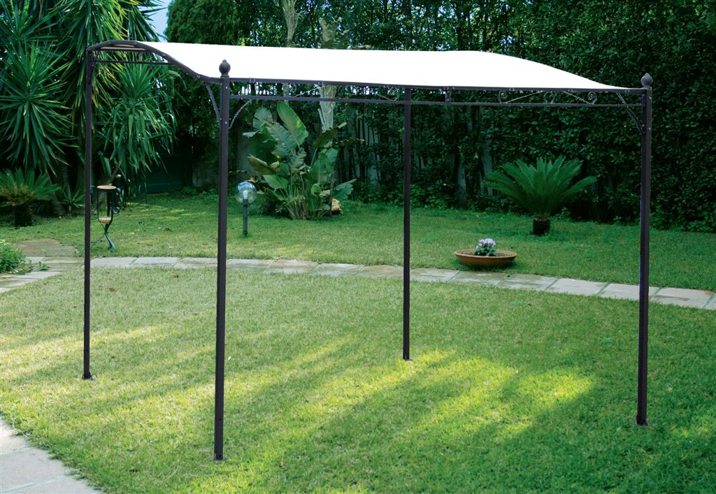 Pavillon mit brauner, mit Epoxidpulver beschichteter Eisenstruktur, 4 vertikalen Stangen 40 x 40 mm, ecrufarbenem, wasserabweisendem Polyester- und PVC-Gewebe 250 g/m2, Pergola-förmiges Dach. Produkt zum Zusammenbauen.