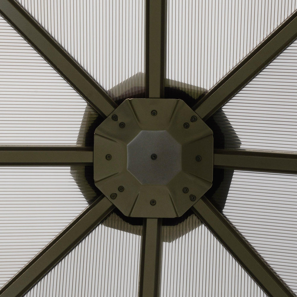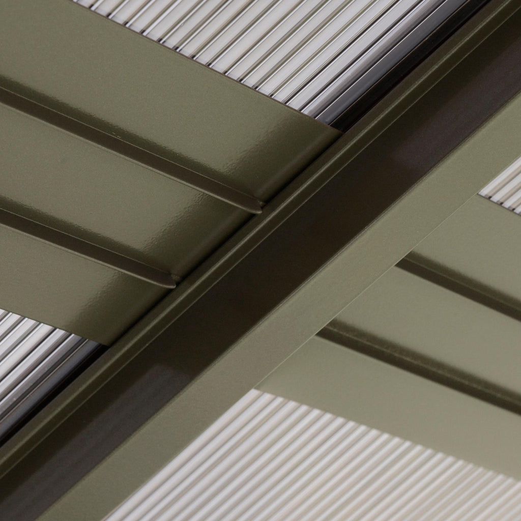 - POLYCARBONAT-DACH: Das Spitzdach des Pavillons besteht aus einer Polycarbonatplatte zum Schutz vor UV-Strahlen, leichtem Regen und Wind.
