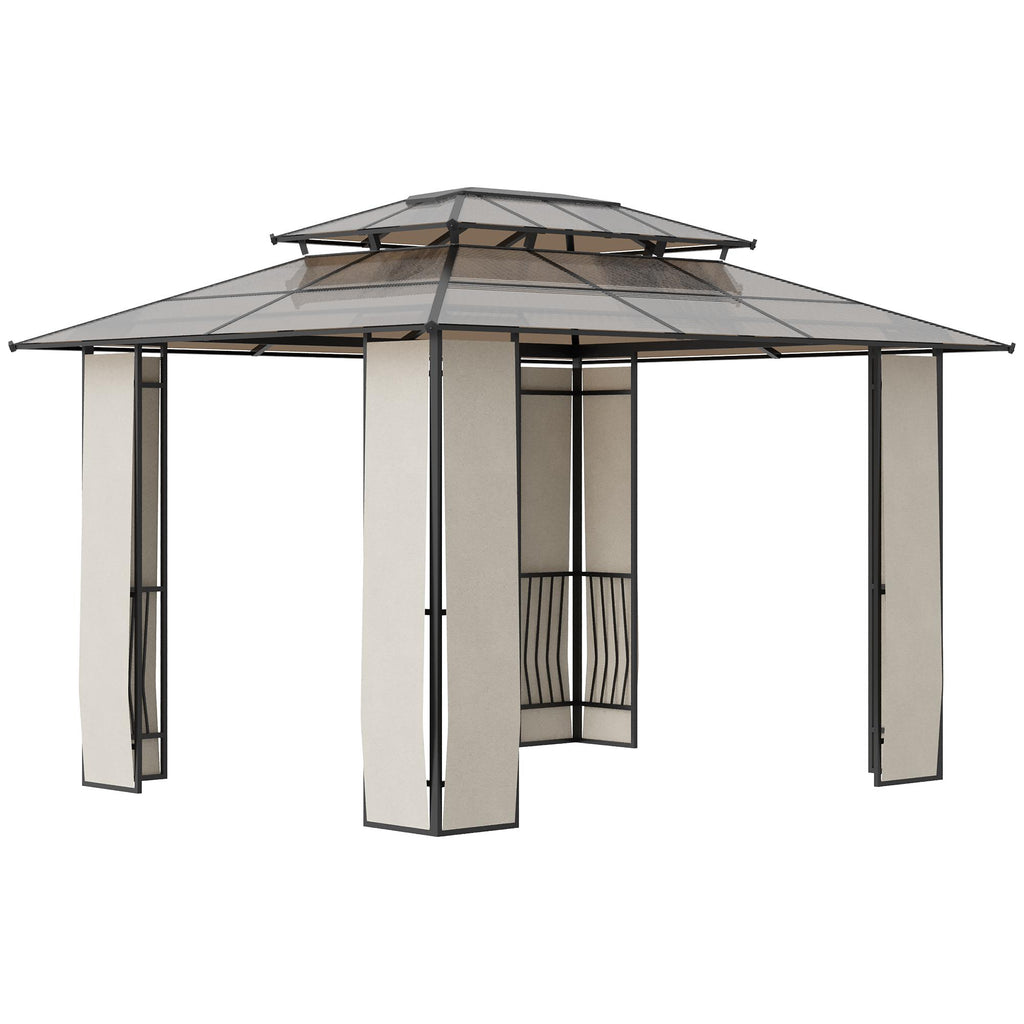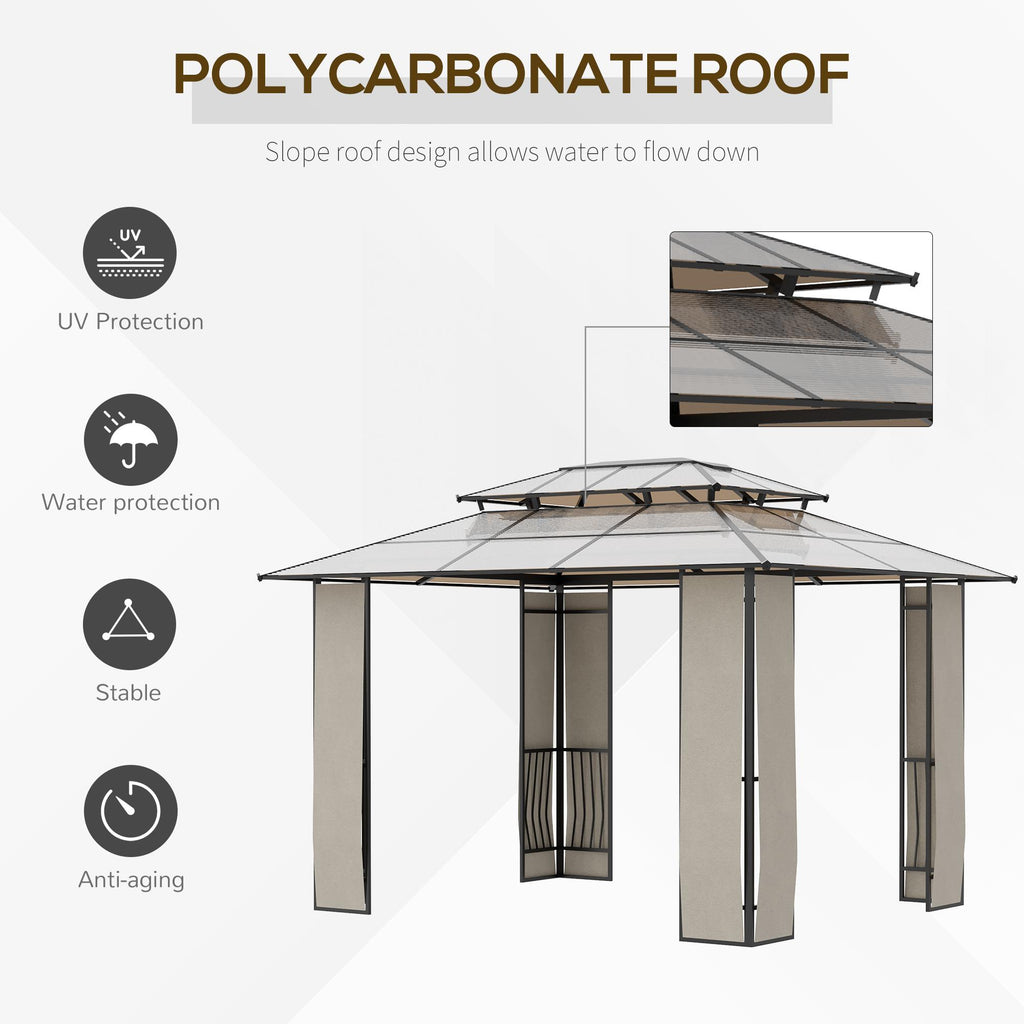 Verleihen Sie Ihrem Außenbereich mit diesem Gartenpavillon einen Hauch von Eleganz. Das Hardtop mit Polycarbonatplatten schützt vor UV-Strahlen und leichtem Regen und sorgt dank des 2-Level-Designs für einen optimalen Luftstrom. Die Aluminium- und Stahlkonstruktion ist robust und sicher, und Sie können sie mit den mitgelieferten Erdnägeln fest im Boden verankern, um eine optimale Stabilität zu gewährleisten. Organisieren Sie Ihre Partys im Freien unter diesem Pavillon!