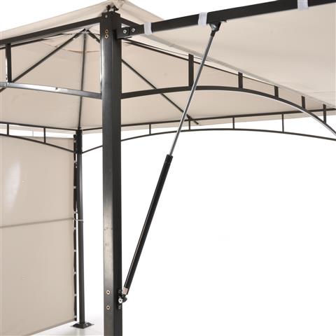 Pavillon mit Belüftung und doppelt faltbarem Vordach mit Gaskolben-Öffnungs-/Schließsystem, Struktur aus dunkelgrauem pulverbeschichtetem Eisen, Polyester-Dachstoff gr. 250/qm Beige Farbe bezogen mit PU (Polyurethan) Polyester Baldachin Stoff gr. 160/m² 300 x 300 cm, Baldachin 300 x 219 cm, Beinabschnitt 45 x 45 x 0,8 mm, Querstangenabschnitt 20 x 20 mm, Dachstangenabschnitt 15 x 15 mm Öffnungs-/Schließsystem des Vordachs mit Gaskolben.