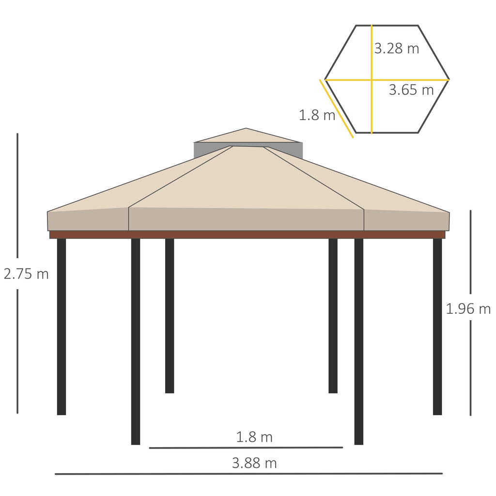 Rendi speciali i tuoi spazi esterni con il gazebo esagonale ! Grazie alle sue ampie dimensioni di 4x4 m è perfetto per posizionare comodamente un salotto da giardino, un set da pranzo, una spa gonfiabile o per organizzare una festa al riparo dal sole. Il tetto a due livelli assicura un passaggio dell'aria ottimale e le tende laterali consentono di proteggersi dal sole e da occhi indiscreti.
