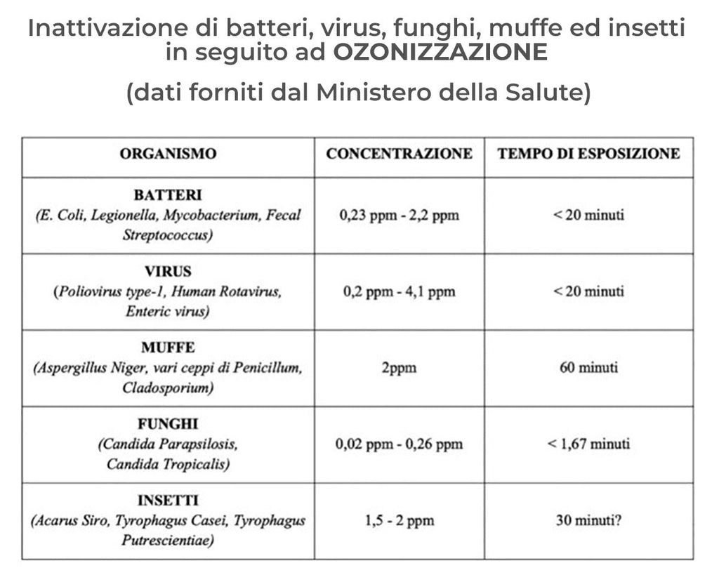 Ozon wurde vom Gesundheitsministerium (Protokoll Nr. 24482 vom 31. Juli 1996) als natürliches Hilfsmittel zur Sterilisation von Umgebungen anerkannt, die durch Bakterien, Viren, Sporen usw. kontaminiert sind. und mit Milben, Insekten etc.