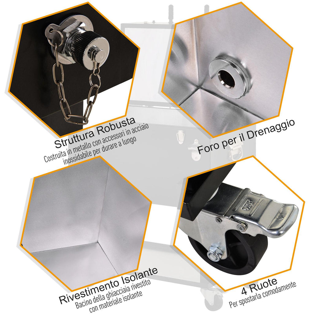- Pulverbeschichtete Stahlkonstruktion mit einem Fassungsvermögen von bis zu 65 l (Flaschen, Eis, Getränke)
