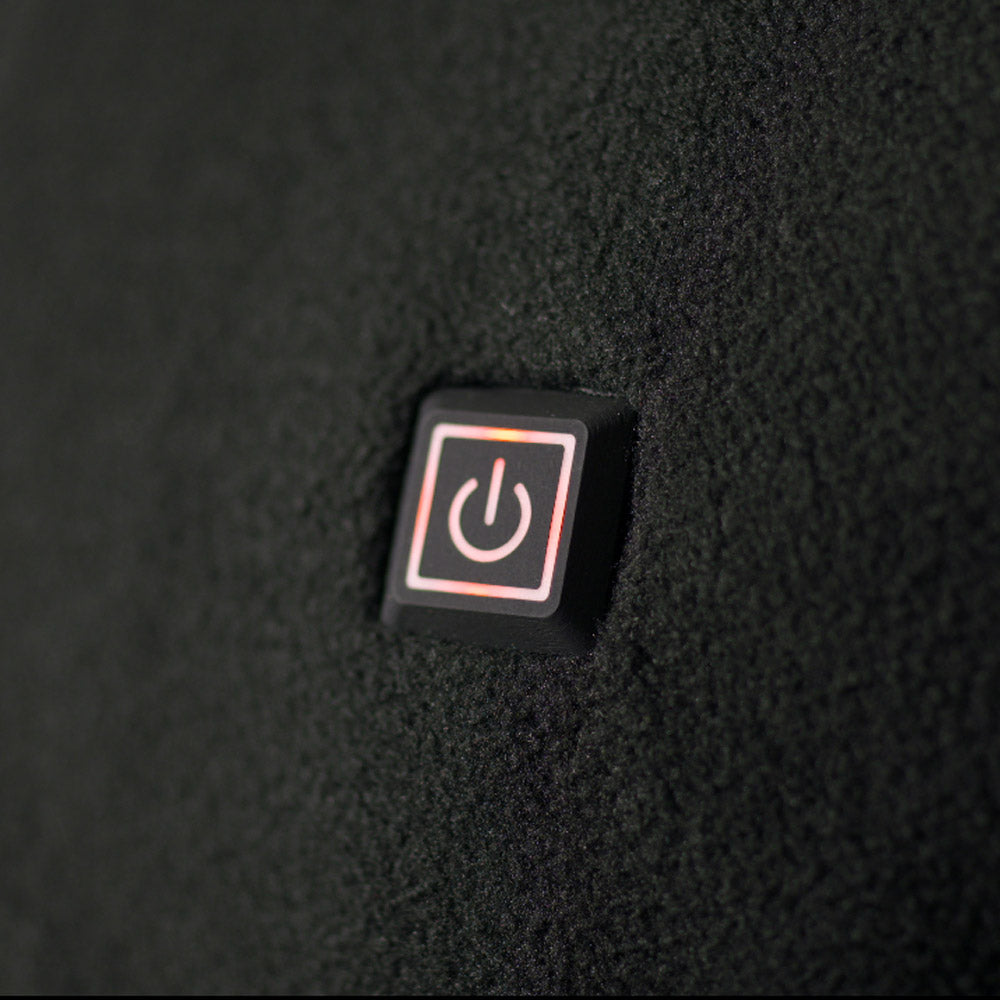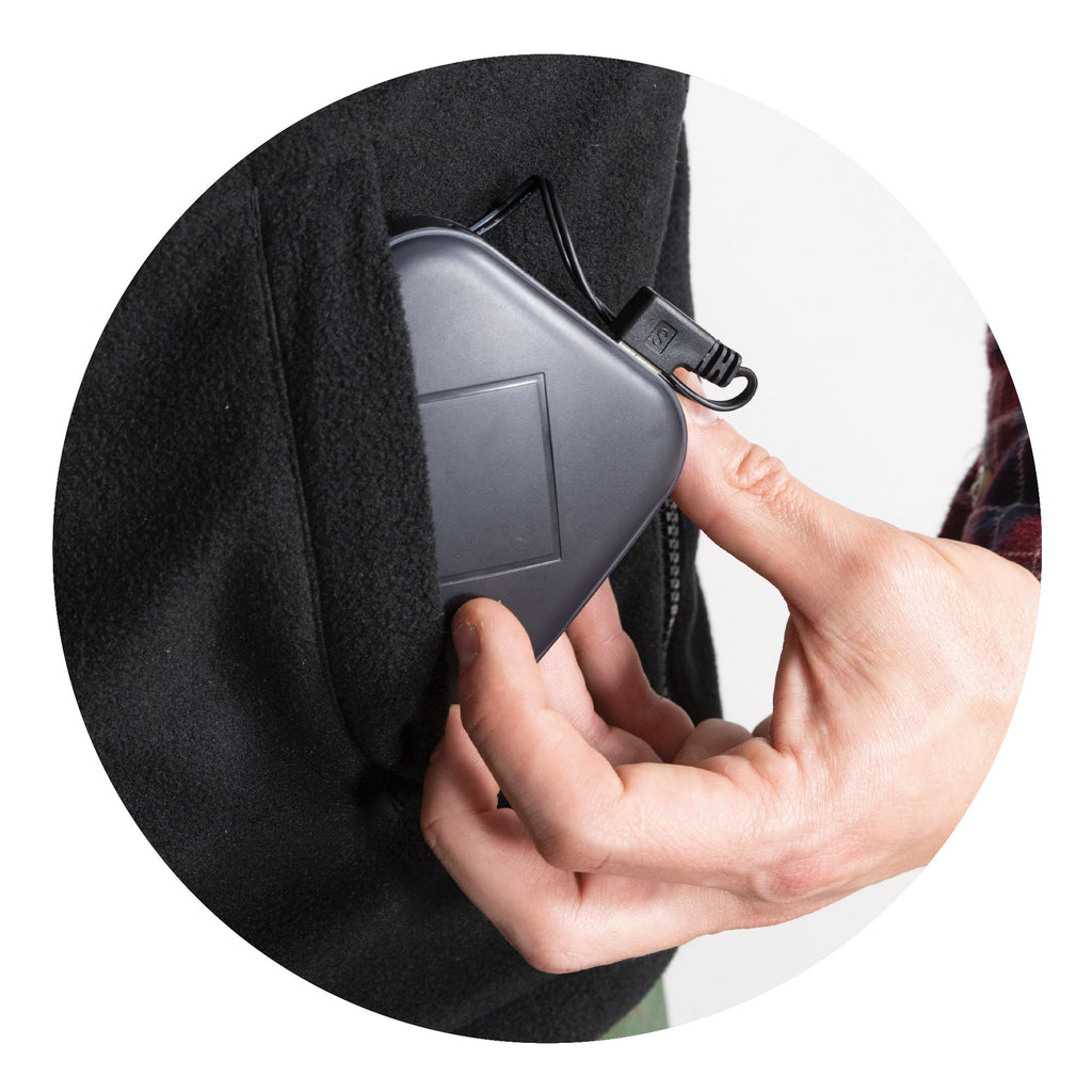 Es wird mit einem Klick aktiviert, ohne zu warten, bis sich der Raum aufheizt, und ohne unnötig Wärme zu verschwenden: Schließen Sie einfach eine einfache Powerbank in der linken Tasche an und drücken Sie die Wärmeaktivierungstaste.
