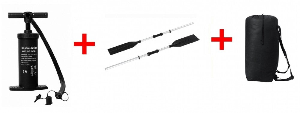 Das Kit enthält ein Paar Aluminiumruder und eine doppeltwirkende Pumpe.