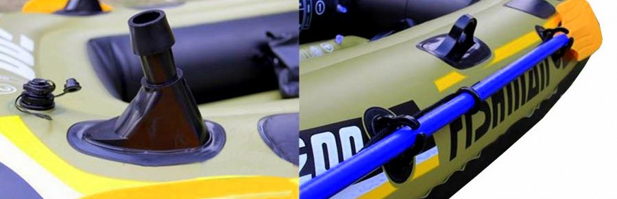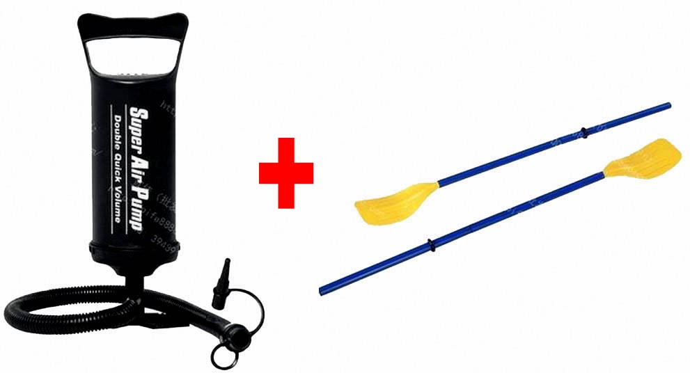 Ein Paar Aluminium-Ruder und eine doppeltwirkende Pumpe sind im Lieferumfang enthalten .