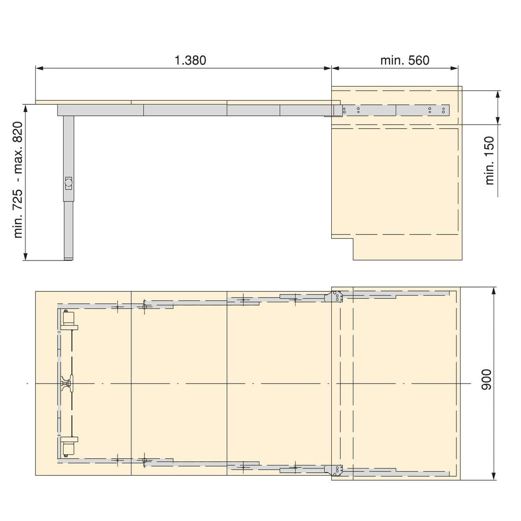 Der Partytisch ist mit einem klappbaren Absaugsystem mit doppelt teleskopierbaren Beinen ausgestattet, dieses System ist für die Küche konzipiert, auch wenn es in anderen Bereichen des Hauses verwendet werden kann. Das Party-System kann in Modulen mit einer Breite von 900 mm und einer Mindesttiefe von 560 mm installiert werden, wodurch eine Tischlänge von 1.380 mm und eine Tragfähigkeit von 100 kg erreicht werden Der Tisch wird durch 3 Platten erhalten, die sich mit öffnen lassen Mithilfe von Scharnieren sind die Tischplatten im selben Raum wie der Mechanismus untergebracht, wenn der Tisch nicht verwendet wird. Die Vorderseite des Schranks muss nach dem Abstellen des Tisches Scharniere zum Öffnen haben. Das Bein ist klappbar und höhenverstellbar, außerdem haben das Bein und die Führungen ein Verriegelungssystem, wenn der Tisch verwendet wird.Die Tische, die die Auflagefläche bilden, sind nicht im Lieferumfang enthalten.