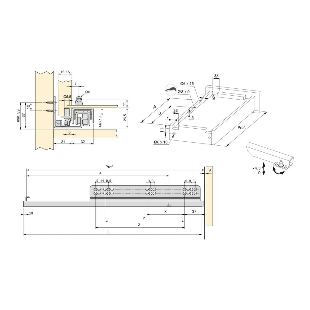Slippe Unterputzführungen für Vollauszüge mit Push-System P 390 Stahl weiß verzinkt Emuca