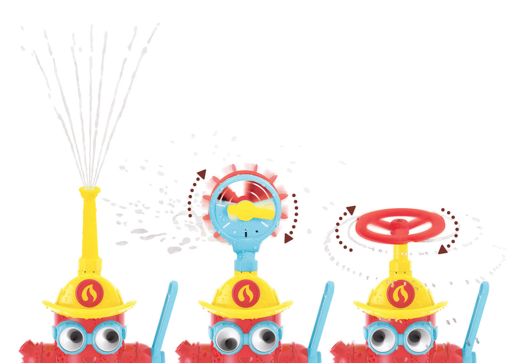 - Außergewöhnlicher Sprühschlauch - Schlauchdüse - Feuerrad, das sich dreht und Wasser versprüht - Sich drehender Whirlpool, der wie verrückt in alle Richtungen spritzt. - Austauschbares Zubehör, das am Körper des Hydranten befestigt ist, für einfaches Spielen und Aufbewahren.