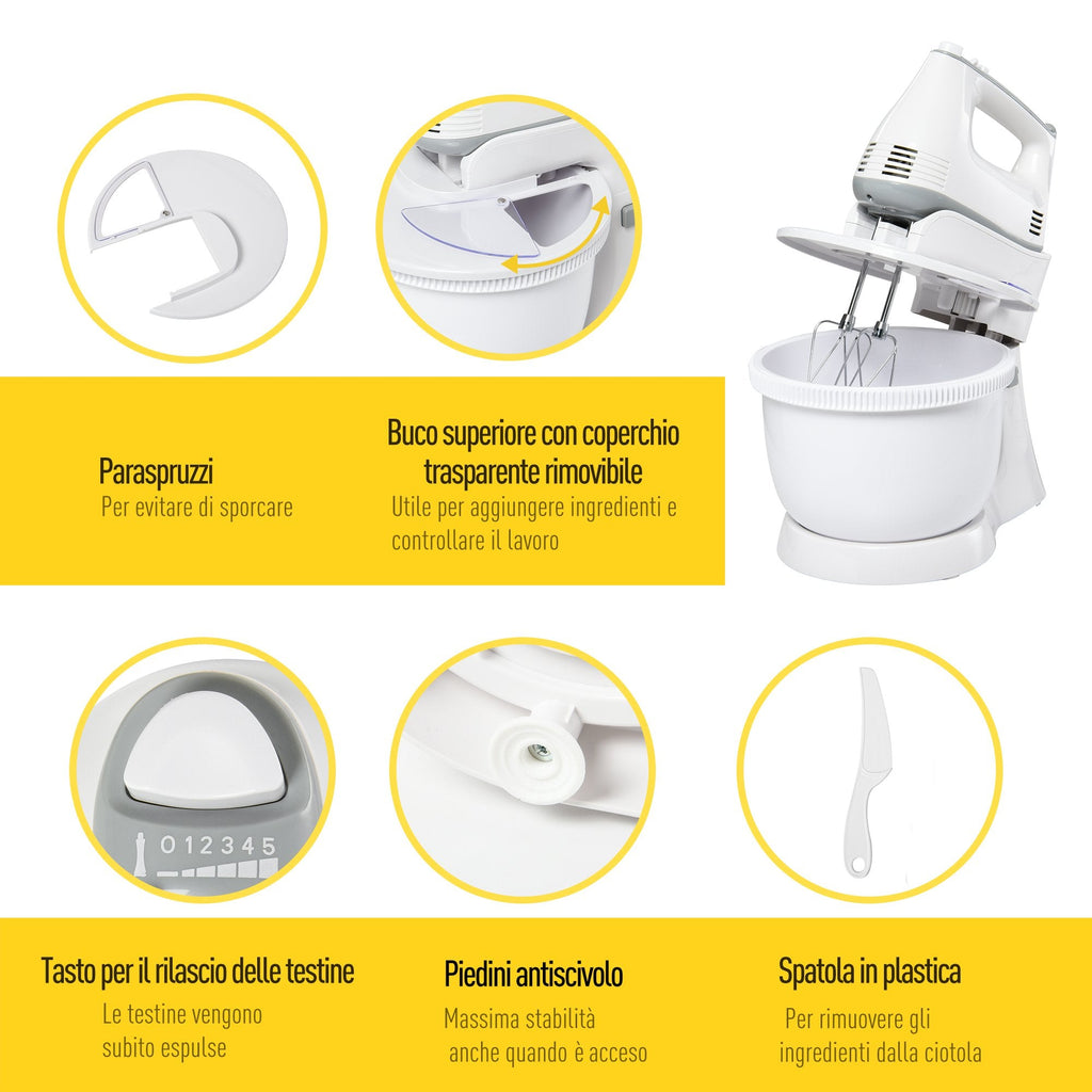 - DESIGN 2-IN-1: Mixer cucina che può essere utilizzato in combinazione con la ciotola planetaria da 3.4L o solamente come mixer a mano. Il paraspruzzi integrato ti aiuta a tenere pulito.