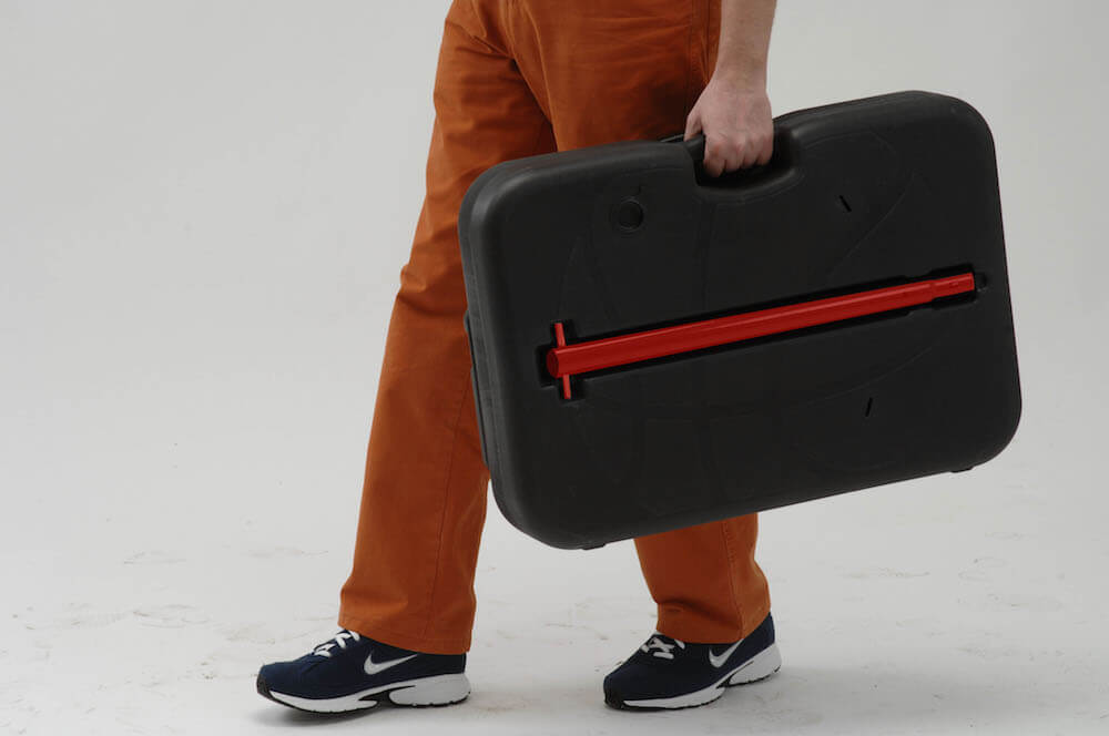 Die Basis verwandelt sich in einen praktischen, platzsparenden Koffer, in dem alle Komponenten aufbewahrt werden können.