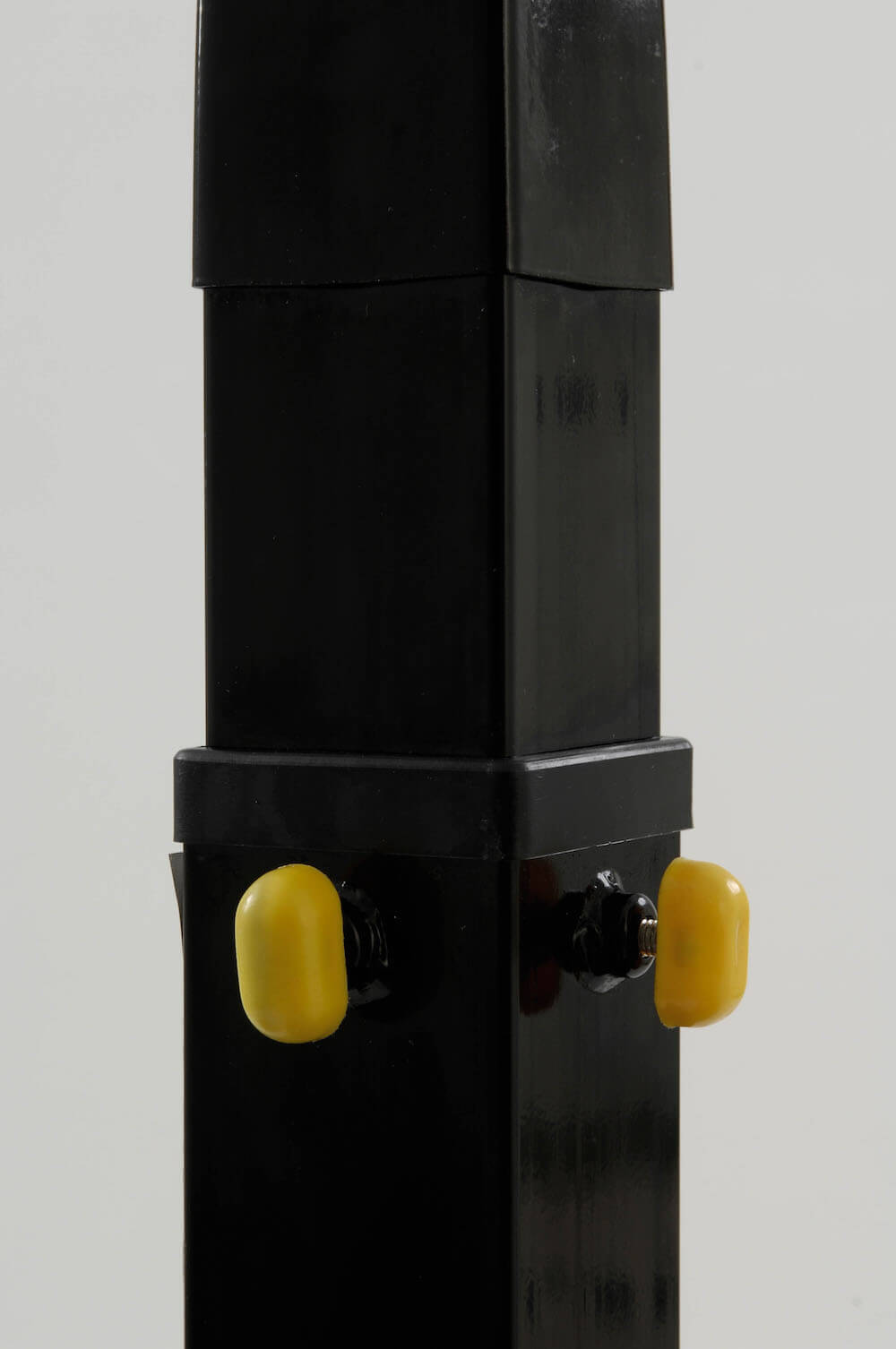 Höhenverstellbare vertikale Struktur aus Teleskop-Stahlrohr mit quadratischem Querschnitt 80 x 80 mm und Verstärkungsstreben, schwarz pulverbeschichtet.