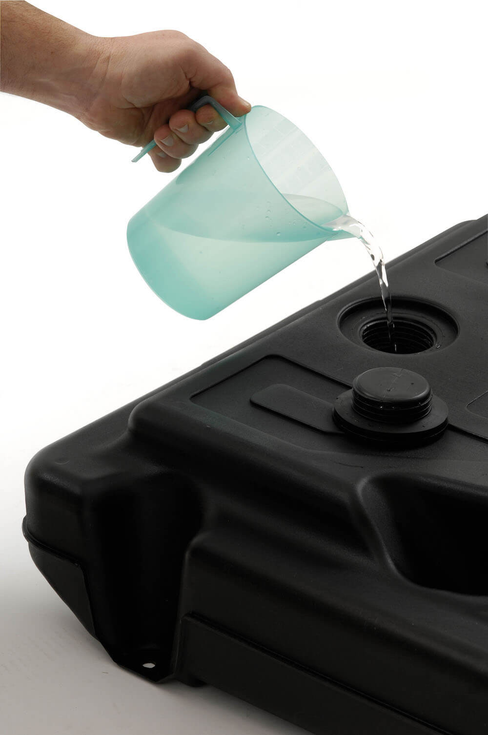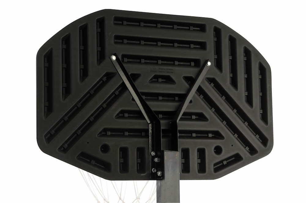 Basis aus schwarzem, geformtem Polyethylen, ausgestattet mit Rädern auf der Vorderseite, die mit Wasser oder Sand gefüllt werden können, um maximale Stabilität während des Spiels zu gewährleisten. Zwei Ablauflöcher ermöglichen ein einfaches Befüllen und Entleeren des Bodens.