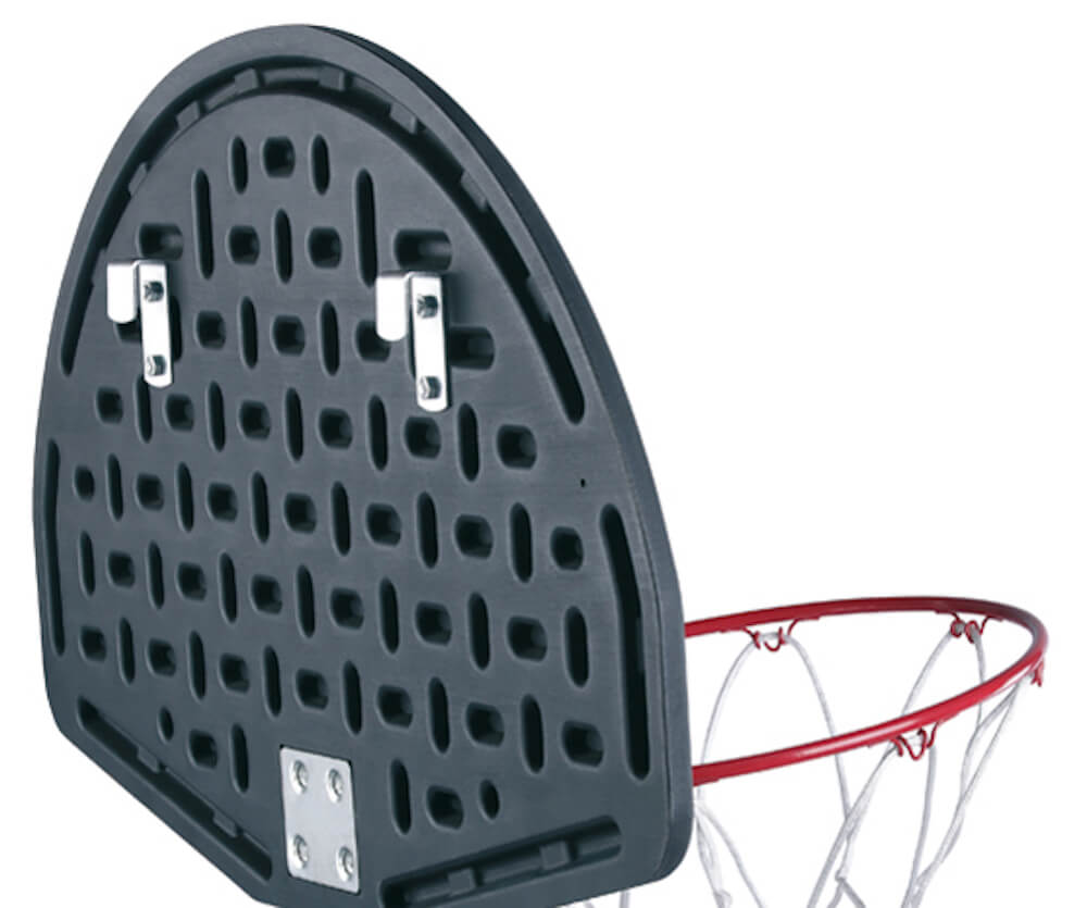 Basis aus schwarzem, geformtem Polyethylen, ausgestattet mit Rädern auf der Vorderseite, die mit Wasser oder Sand gefüllt werden können, um maximale Stabilität während des Spiels zu gewährleisten.