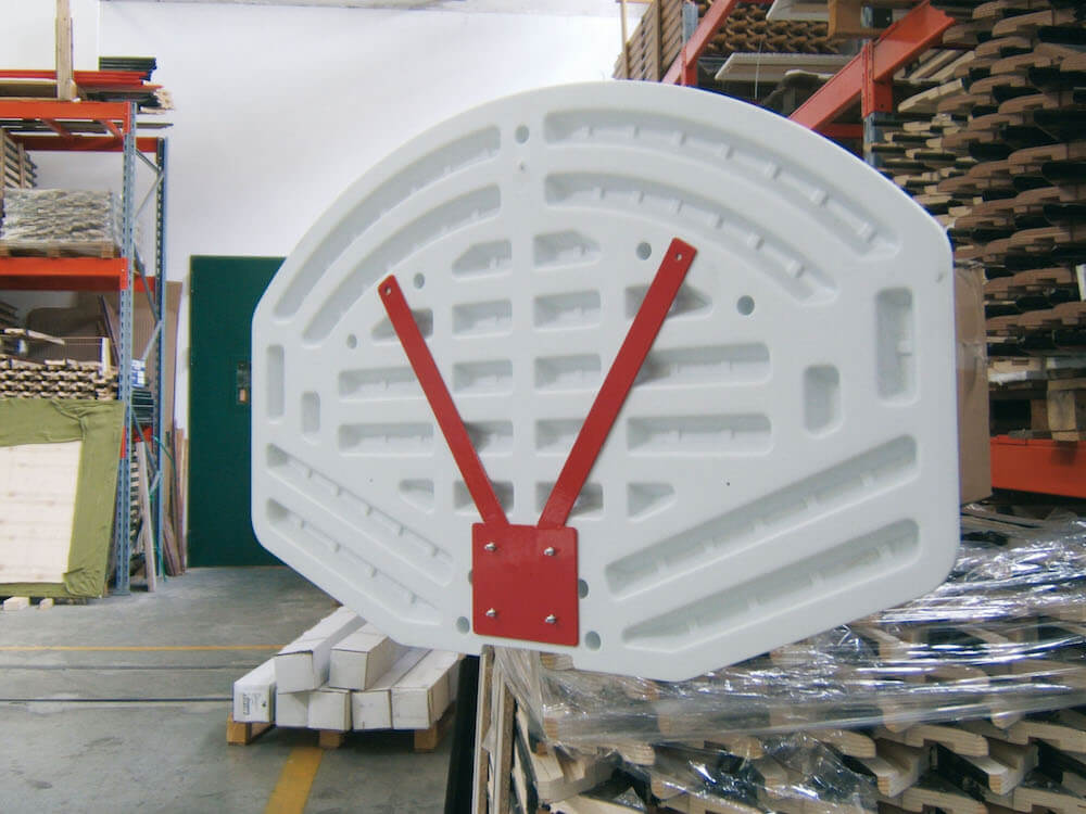 Das Zielbrett mit roten Linien auf weißem Hintergrund wird durch einen roten pulverbeschichteten Stahlbügel mit einem festen Kreis von ø 45 cm und einem Polypropylennetz für den Außenbereich ergänzt.