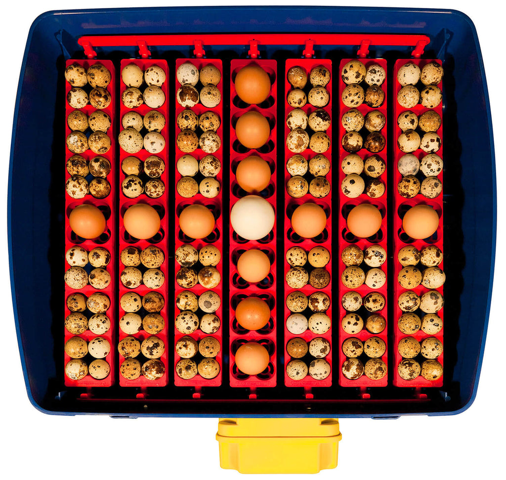 1) UNIVERSELLES TABLETTSYSTEM : Der erste und einzige professionelle Eierhalter der Welt, der jede Art von Ei vertikal aufnehmen kann, von Gänseeiern bis hin zu Wachteleiern. Tatsächlich können Sie in jeden einzelnen Schlitz einlegen: 1 Hühnerei (oder von größeren Arten) oder 4 kleine Eier, bis zu insgesamt 96 Wachteleiern. Ein innovatives System in der Eierlogistik, das es Ihnen ermöglicht, so viele Eier wie möglich auf kleinem Raum unterzubringen und so den Energieverbrauch drastisch zu senken. HINWEIS: Die vertikale Position der Eier während der Inkubation ist die gleiche wie in den industriellen Brütereien der neuesten Generation. Es garantiert immer deutlich höhere Schlupfprozente als Eier, die in den alten, technisch veralteten Brutmaschinen horizontal bebrütet werden.