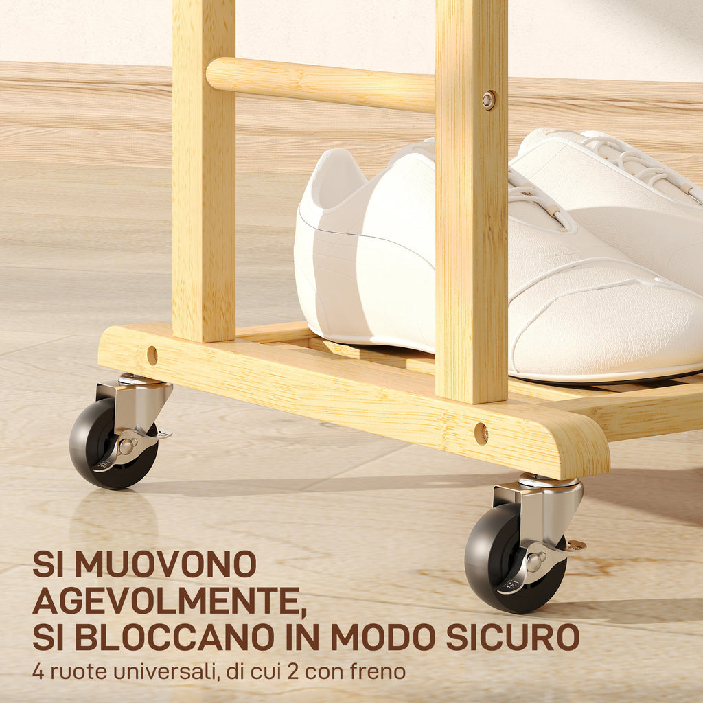 Indossatore Servomuto 4 in 1 a Rotelle 47x33,7x105,5 cm con 2 Aste Vassoio Svuota Tasche e Ripiano per Scarpe in Bambù