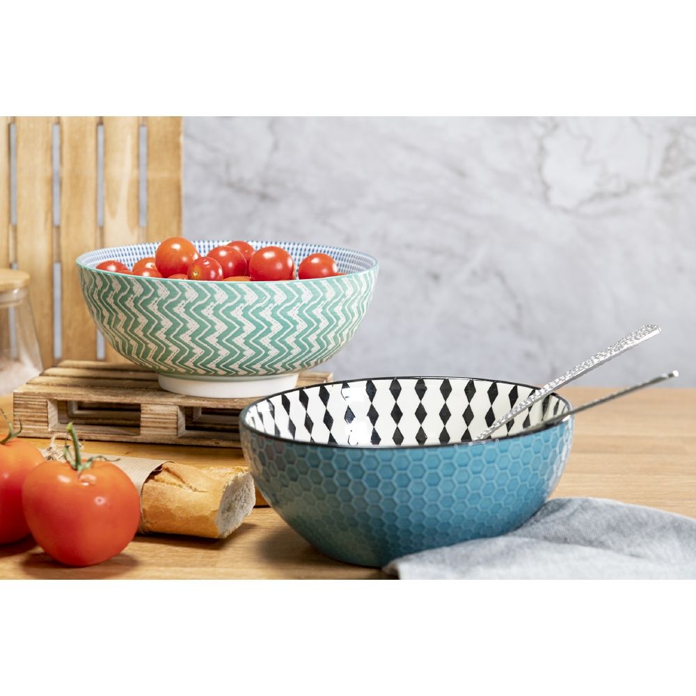 Insalatiere dai motivi geometrici, e con accostamenti inediti di colori e pattern. Le stampe all'interno si differenziano da quelle all'esterno, regalando un tocco etnico alla tavola, ma anche al momento del pasto. Sono perfette sulle apparecchiate più moderne e chic.