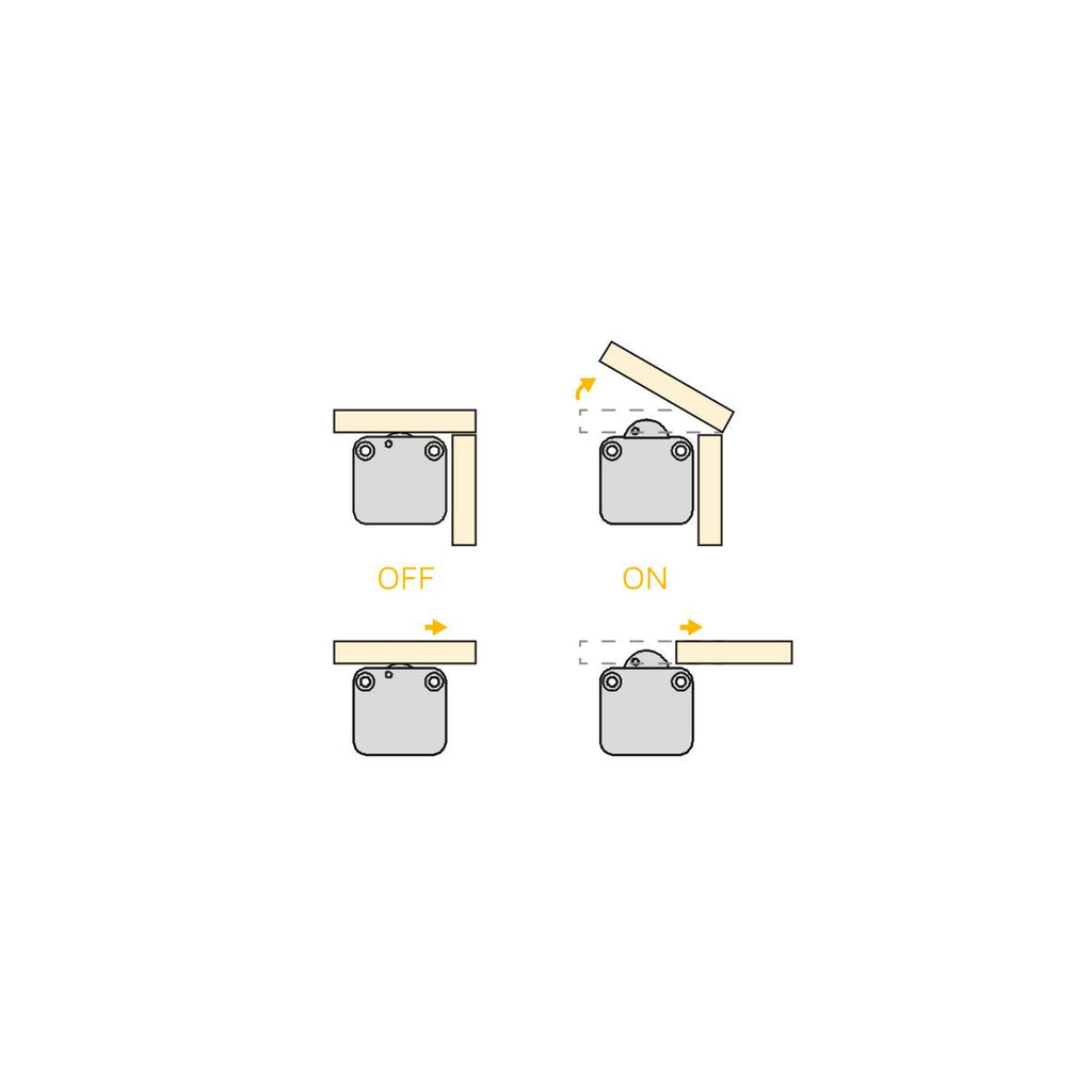Schalter zum automatischen Ein- und Ausschalten der Lampen beim Öffnen und Schließen der Tür. Auf diese Weise geht die Beleuchtung beim Öffnen der Tür an und beim Schließen der Tür aus. Dank seiner geringen Größe und der einfachen Montage durch Verschrauben mit der Möbeloberfläche ist er für den diskreten Einbau in Wohn- und Büromöbeln konzipiert. Zudem ist der Türschalter sowohl für Möbel mit Dreh- als auch Schiebetüren geeignet.