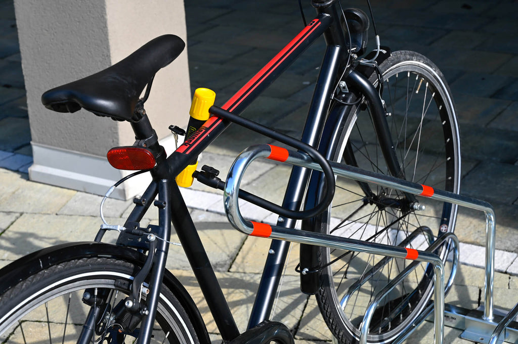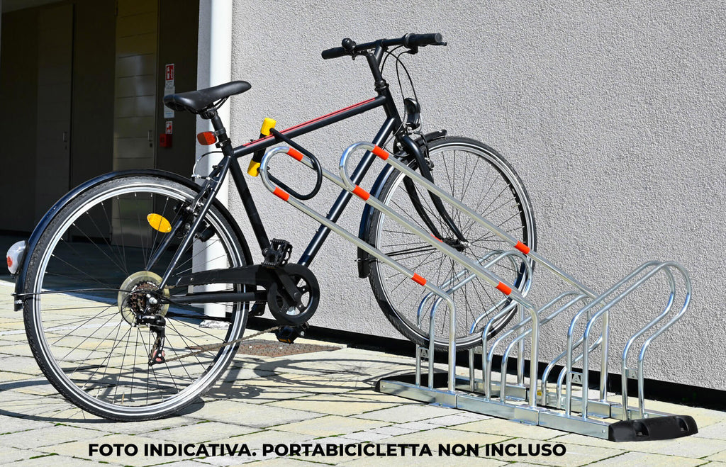Ständer, der auf einem Fahrradträger installiert werden kann, um das Fahrrad mit einem Vorhängeschloss zu verschließen. Korrosionsschutzbehandlung durch galvanische Verzinkung.