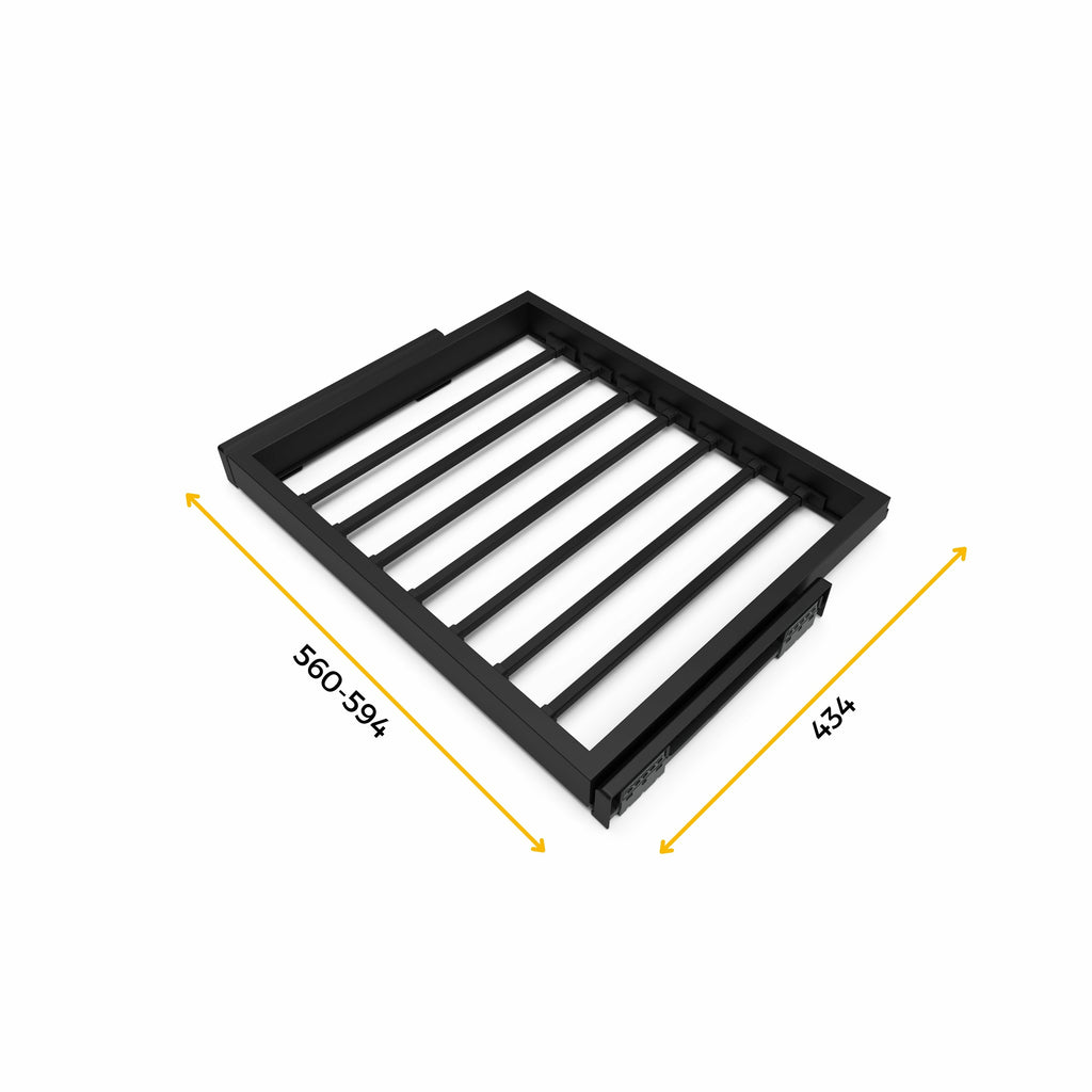 Kit composto da 7 aste per pantaloni e da un telaio con guide regolabili in larghezza. La rastrelliera Hack per gli accessori del guardaroba è realizzata con uno stile minimalista accuratamente progettato, che si distingue per la sua finitura strutturata in grigio pietra o nero, che è l'ultima tendenza nel design degli armadi in camere da letto e spogliatoi. Rende più comodo riporre i vestiti grazie alle guide a estrazione totale con chiusura ammortizzata, che consentono di aprire e chiudere il telaio lentamente e silenziosamente per evitare urti, con pezzi di rifinitura per nascondere le guide. Disponibili per moduli da 600, 800 e 900 mm, i telai per moduli da 80 e 90 includono un vassoio ausiliario per riporre indumenti e oggetti.