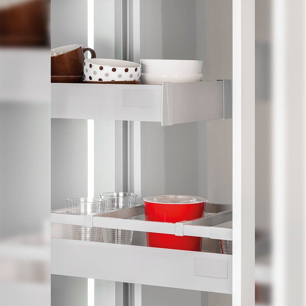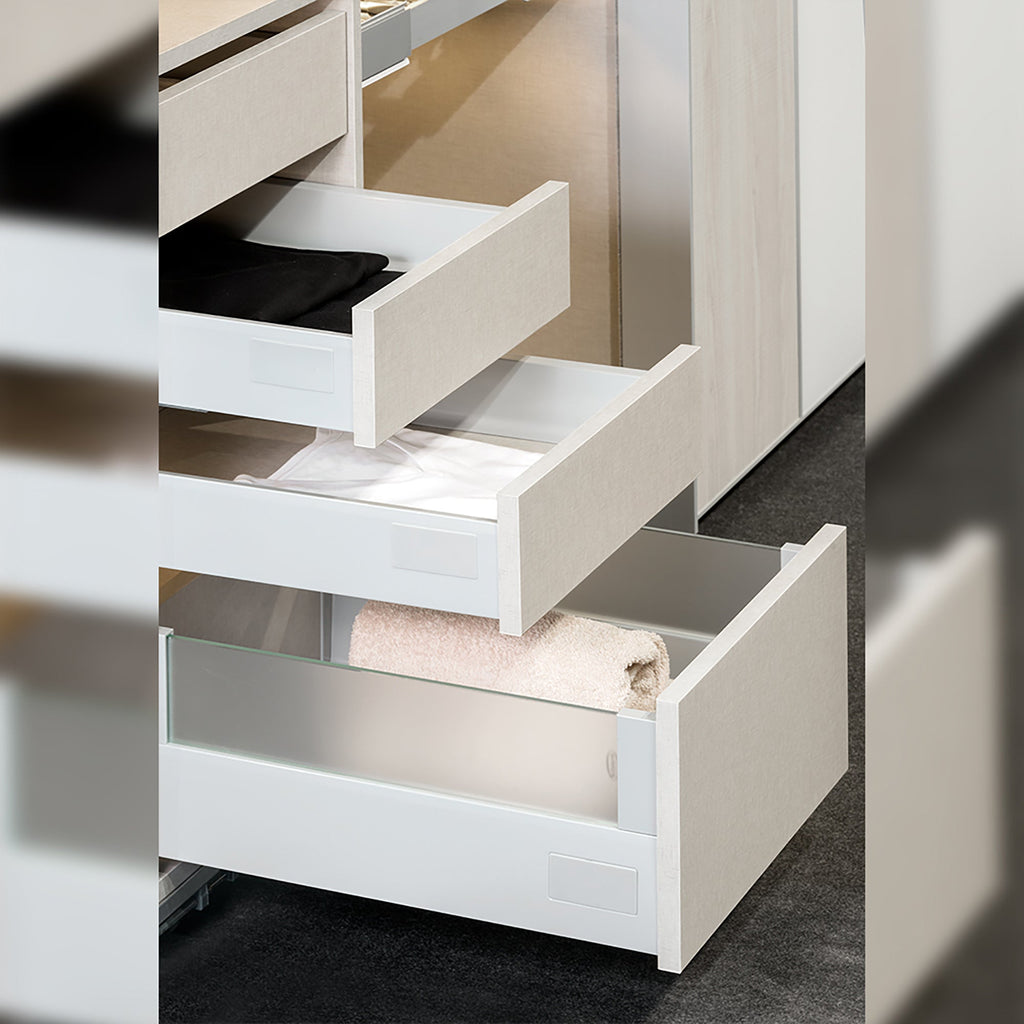 Die Vantage Q Küchen- und Badschublade ist im Bausatzformat mit allem notwendigen Zubehör für die Montage erhältlich. Sie sind auch für ihre große Tragfähigkeit bekannt, die bis zu 35 kg pro Schublade tragen kann. Beinhaltet Kufen mit Vollauszug und Softclosing , Hakensatz, Stangensatz (H141 und H204) und Seitenteile in weiß oder aluminiumlackierter Ausführung erhältlich. Lediglich für den Boden, die Rückwand und die Schubladenfront benötigen Sie die auf die richtige Größe zugeschnittenen Bretter.