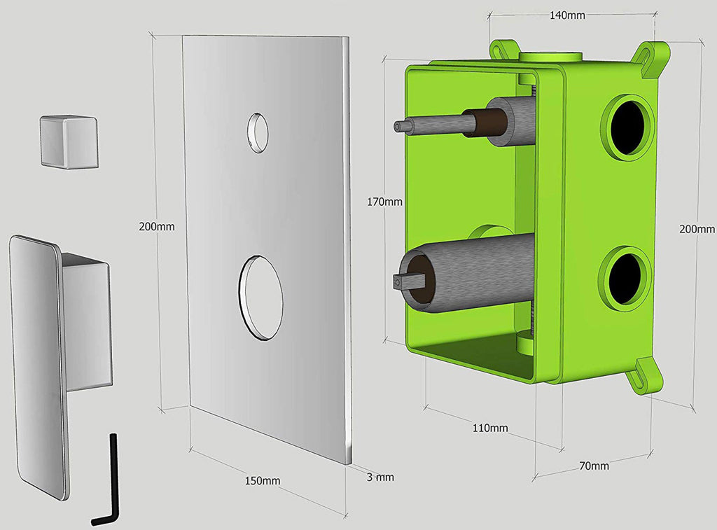 - Eingebauter Mischer aus verchromtem Messing mit 3 Wegen / Ausgängen