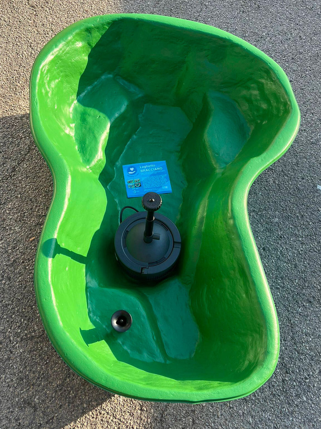 I laghetti sono realizzati in polietilene rigenerato atossico. La colorazione verde, a differenza di quella classica nera, attrae meno i raggi solari. In questo modo si evita il surriscaldamento dell'acqua che potrebbe causare un mal vivere di pesci e piante acquatiche.