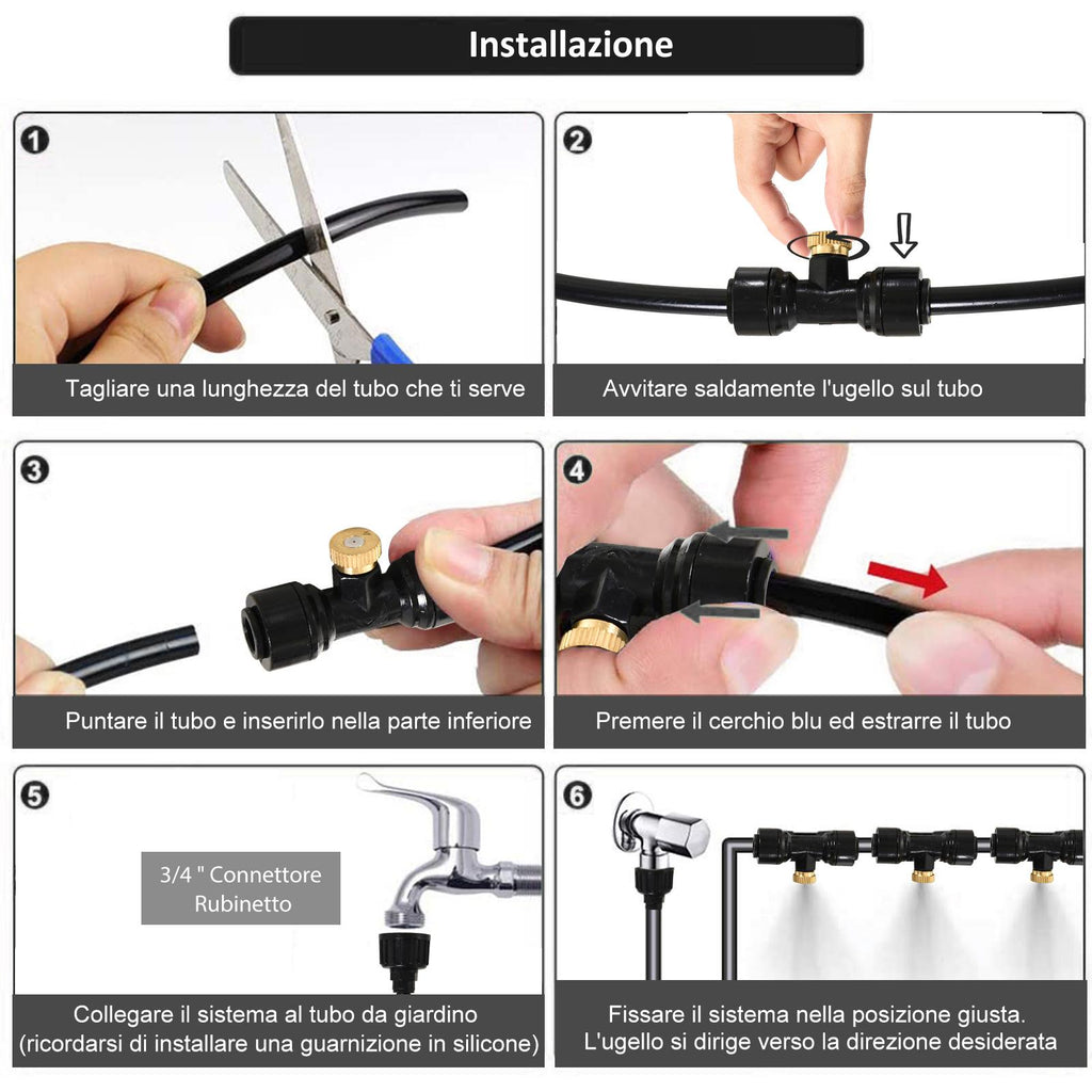 Es ist wirklich heiß im Sommer, findest du nicht? hat die perfekte Lösung, um die Außenumgebung auch an den heißesten Tagen zu erfrischen: einen Gartenvernebler mit Messingdüsen. Im Paket finden Sie ein Kit, das alles enthält, was Sie für die Installation benötigen: Schlauch, Sprühgeräte, T-Stücke, Schlauchschellen und Schellen. Die Montage ist schnell und einfach und Sie können es problemlos auf der Terrasse oder im Gewächshaus (wenn Sie Ihre Pflanzen gießen möchten) aufstellen. Dezent und platzsparend umhüllt er Ihre Umgebung mit einer köstlichen Frische!