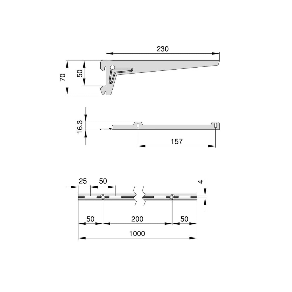 - Es besteht aus zwei 1-m-Profilen und drei Konsolensätzen (rechts und links) für die Installation von drei Holzregalen.