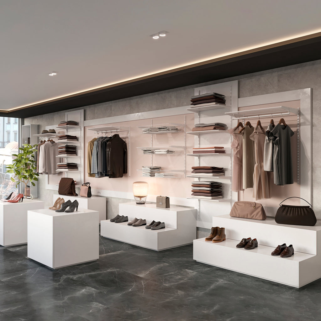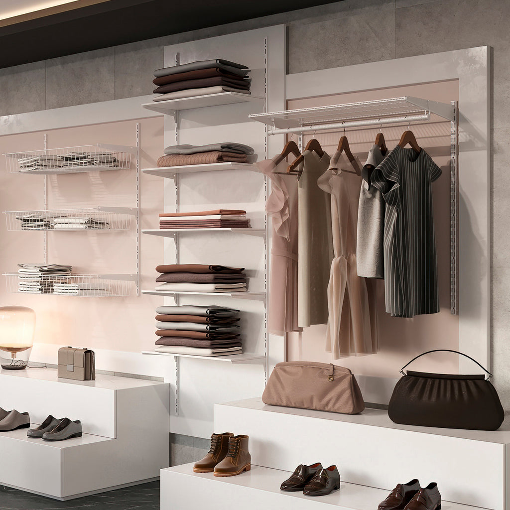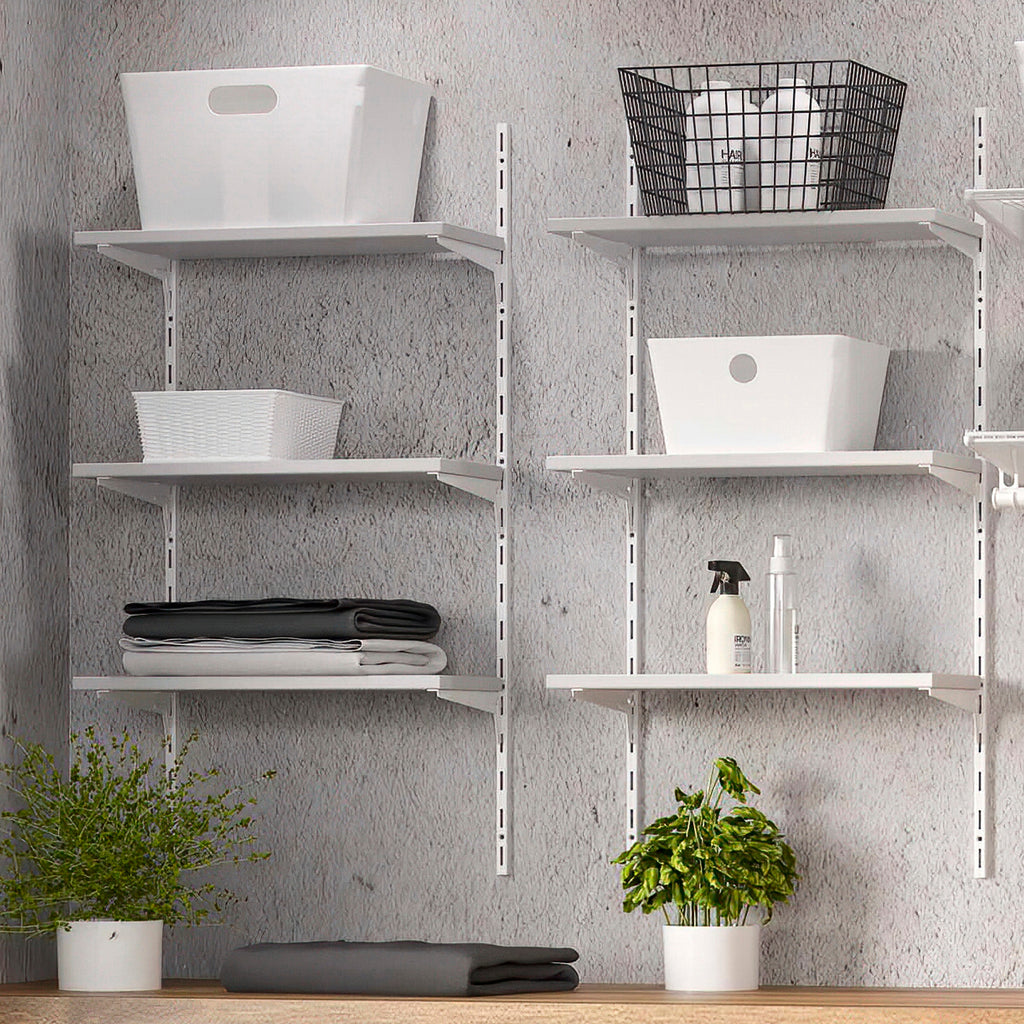 Zubehör-Kit zur Erstellung individueller, an der Wand befestigter Regale. Sie sind ideal für die Innenausstattung von Kleiderschränken, Ankleidezimmern, Waschküchen oder Speisekammern. Sie können mit dem Zubehör von Jagmet kombiniert werden, um eine Vielzahl von Kompositionen zu schaffen.Dieser Bausatz besteht aus zwei 1-m-Regalprofilen mit Einzelschlitzen und drei Regalträgersets (rechts und links), die für die Installation von drei Holzregalen ausgelegt sind. Inklusive Schrauben und Dübel für die Wandmontage.