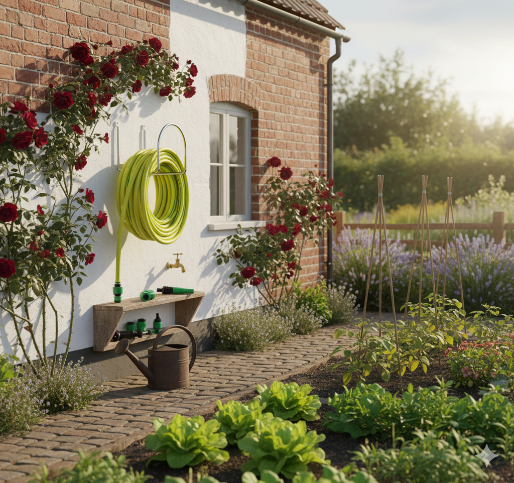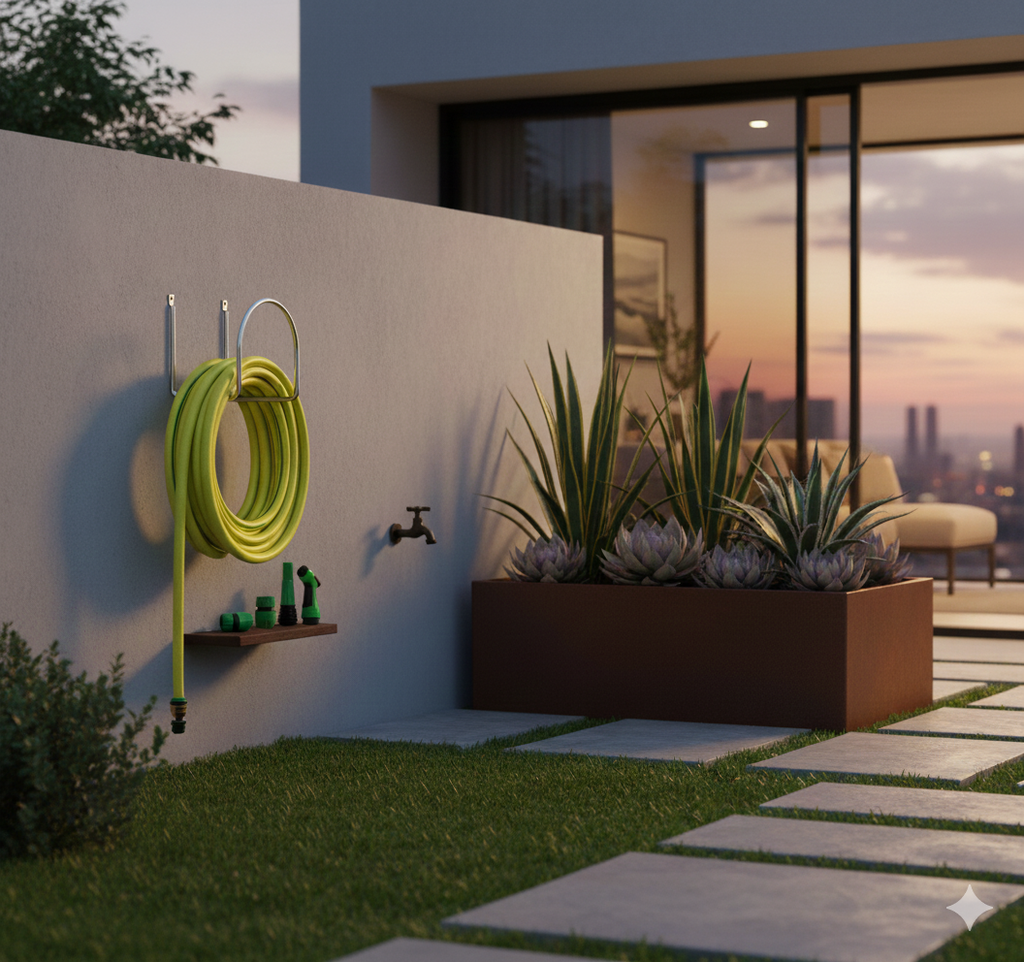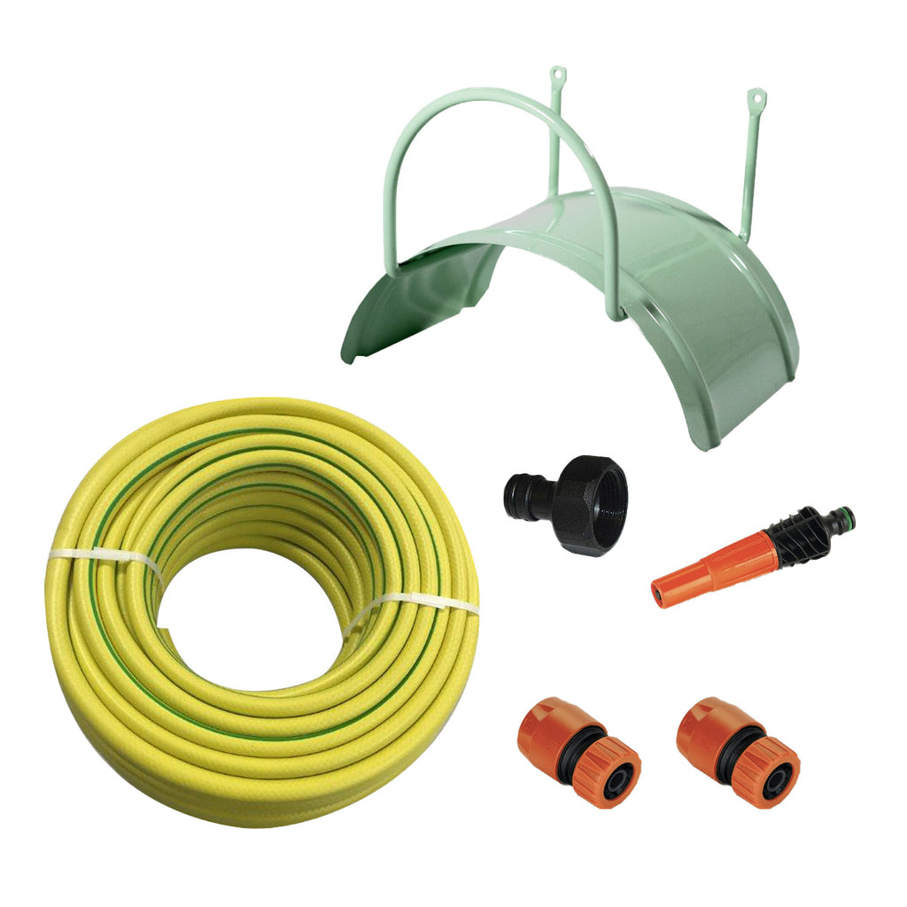 Wandrohrhalter aus verzinktem, verchromtem Stahl, um maximale Festigkeit und Haltbarkeit zu gewährleisten. Ebenfalls enthalten ist eine 25-m-Schlauchrolle und alles Zubehör, das Sie zum Bewässern Ihrer Pflanzen und Ihres Gartens benötigen.
