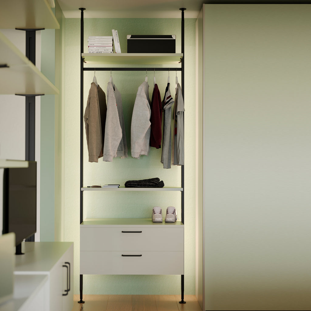 Profili e accessori Zero per scaffalature modulari. I profili sono realizzati in alluminio, e gli accessori di giunzione e i supporti in zamak, il tutto in finitura di vernice nera testurizzata (RAL 9005). Grazie alla sua semplicità e al suo design, si può adattare velocemente il sistema Zero a qualsiasi tipologia di ambiente: casa, cabine armadio, ufficio e negozi. Si possono combinare diversi elementi per creare la tua composizione ideale: mensole in legno o vetro, moduli o piccoli contenitori e barre appendiabiti. Il sistema Zero si caratterizza per la sua facilità di montaggio, poiché non è necessario utilizzare alcun attrezzo per la regolazione. Regola e posiziona i ripiani senza dover smontare nulla e senza attrezzi speciali. Grande capacità di carico poiché può supportare più di 100 Kg per ripiano / modulo . Inoltre, con il suo innovativo sistema di fissaggio Zero, la sua forza di serraggio aumenta all'aumentare del peso che sostiene. Il fissaggio del profilo può essere effettuato mediante diverse forme di montaggio, fissaggio a parete, pavimento o soffitto o combinazioni di entrambi.