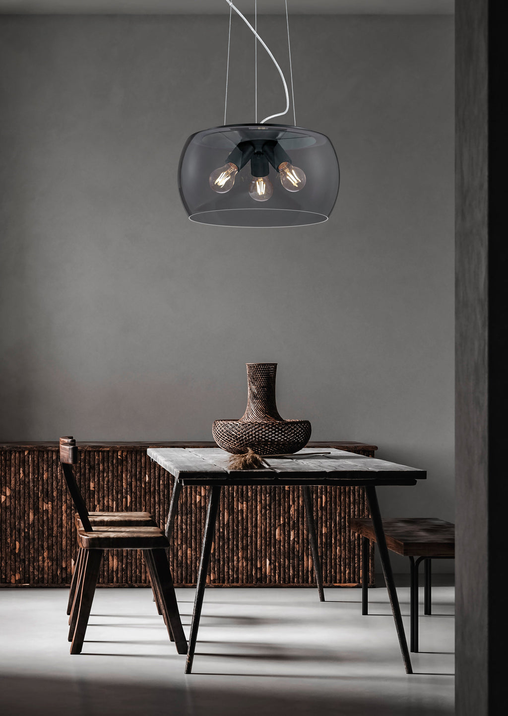 Valente Suspension Large Rauchglas und schwarzes Metall 3 Lichter D. 40Cm