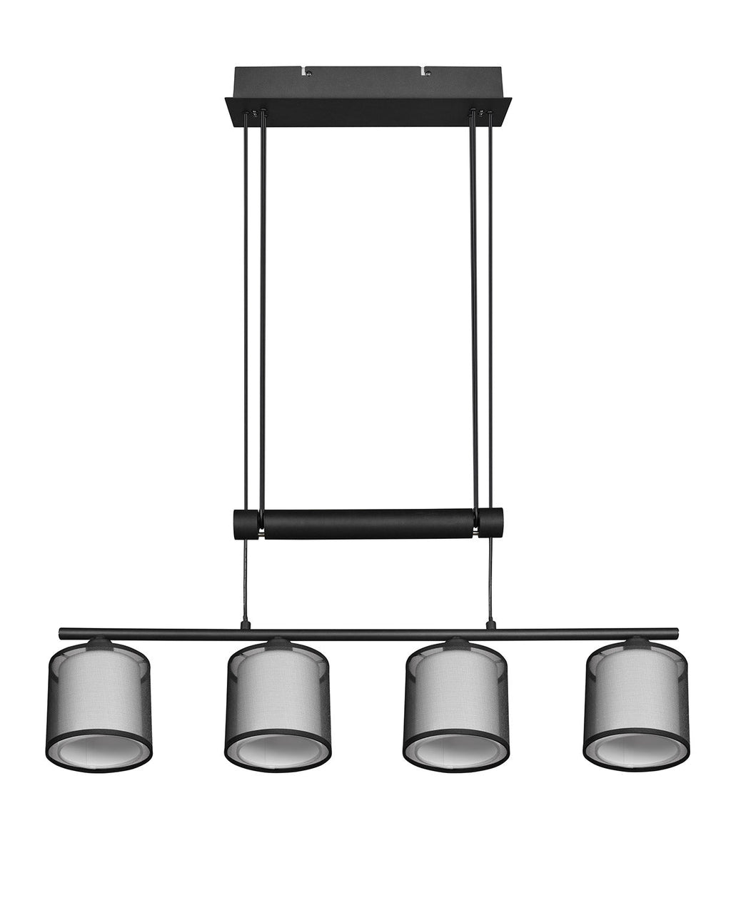 Burton Sospensione Metallo Nero 4 Paralumi Bianchi e Diffusori Esterni Traforati Neri con Sistema di Regolazione Altezza A Bilancere L. 83Cm