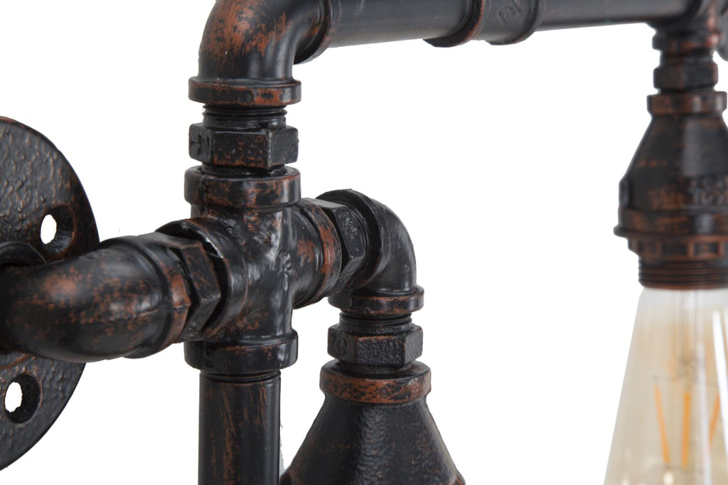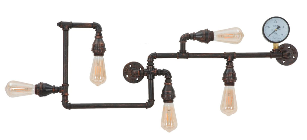 Eisenrohre winden sich in fantasievollen Lampen im Industriestil