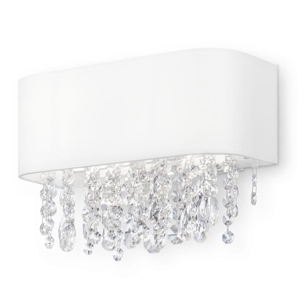 Metallstruktur mit Stofflampenschirm und Kristallanhängern.